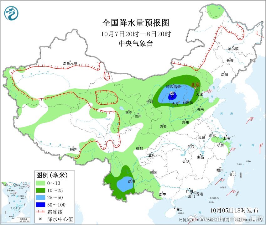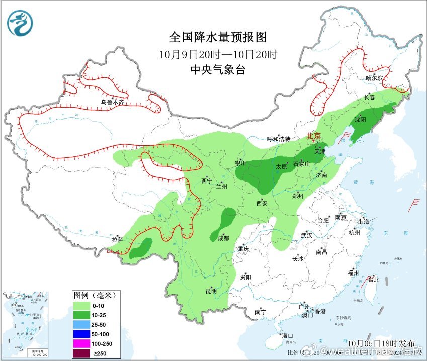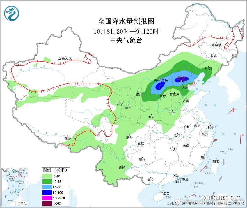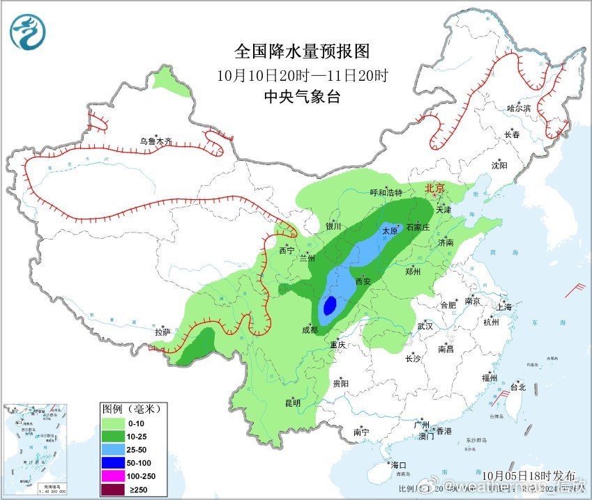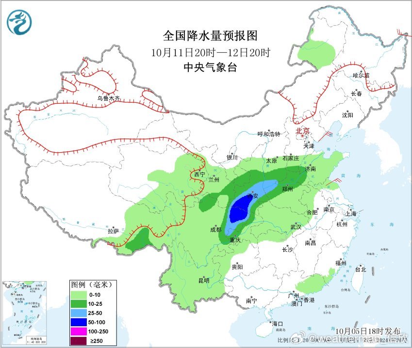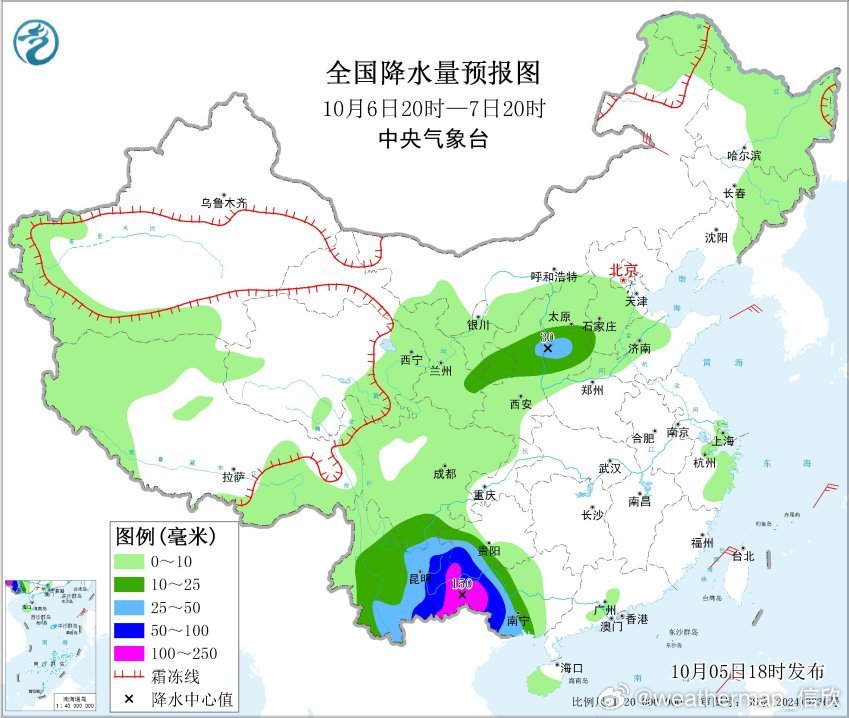 预计10月6日20时至7日20时,西北地区东部、华北中南部、黄淮北部和四川盆地等地有小到中雨,其中,陕西中部和山西中南部局地有大雨;此外,广西西部、云南中东部和贵州西南部等地有大到暴雨,广西西南部和云南东南部局地有大暴雨(100~150毫米)。