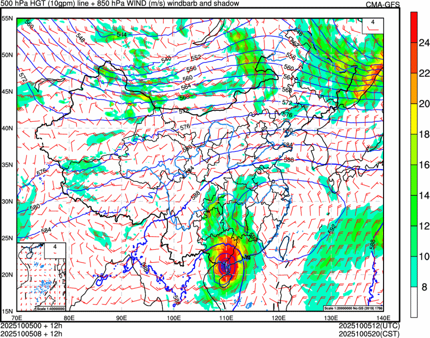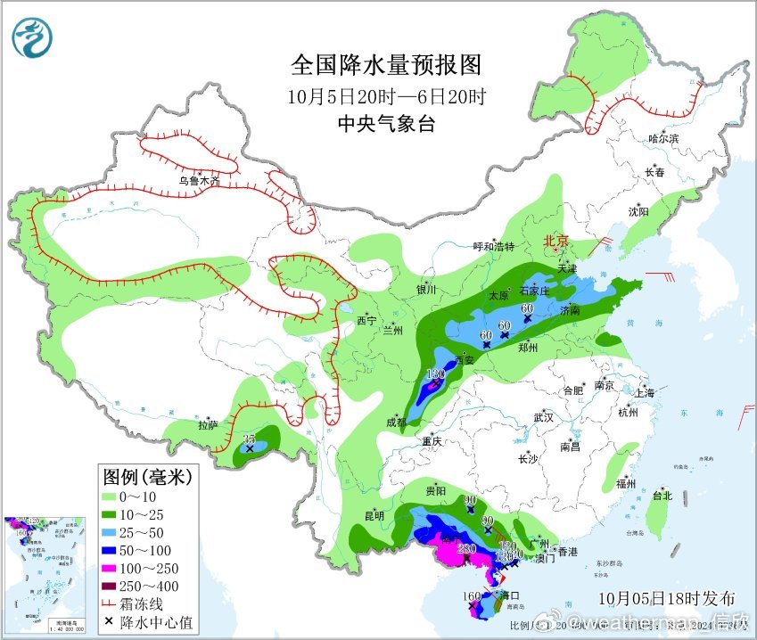 预计10月5日20时至6日20时,华南南部、海南岛以及四川盆地中北部、陕西中南部、河南北部、山东西部和北部、河北中南部、山西中南部、西藏东南部等地部分地区有大到暴雨,其中,广西南部、广东雷州半岛西部沿海、海南岛西部沿海等地部分地区有大暴雨,广西南部沿海局地特大暴雨(250~280毫米)。