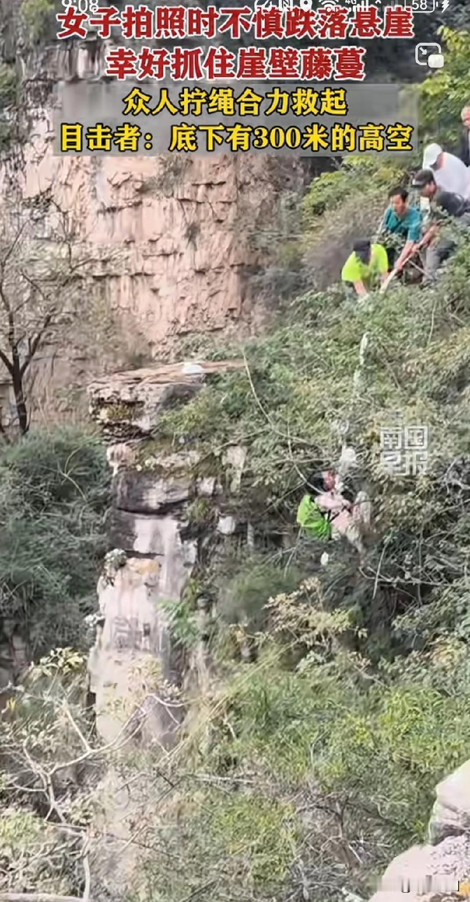 “我要没力气了!”[恐惧] 热心大姐:“不能叫!不能叫!抓着,抓白白的。”看到女子右手缠了好几圈绳子后,指挥上面看不到情况的众人往上拉,最后成功得救! 女子拍照时不慎跌落悬崖,幸好抓住崖壁藤蔓,众人拧绳合力救起,目击者:底下有300米的高空 !