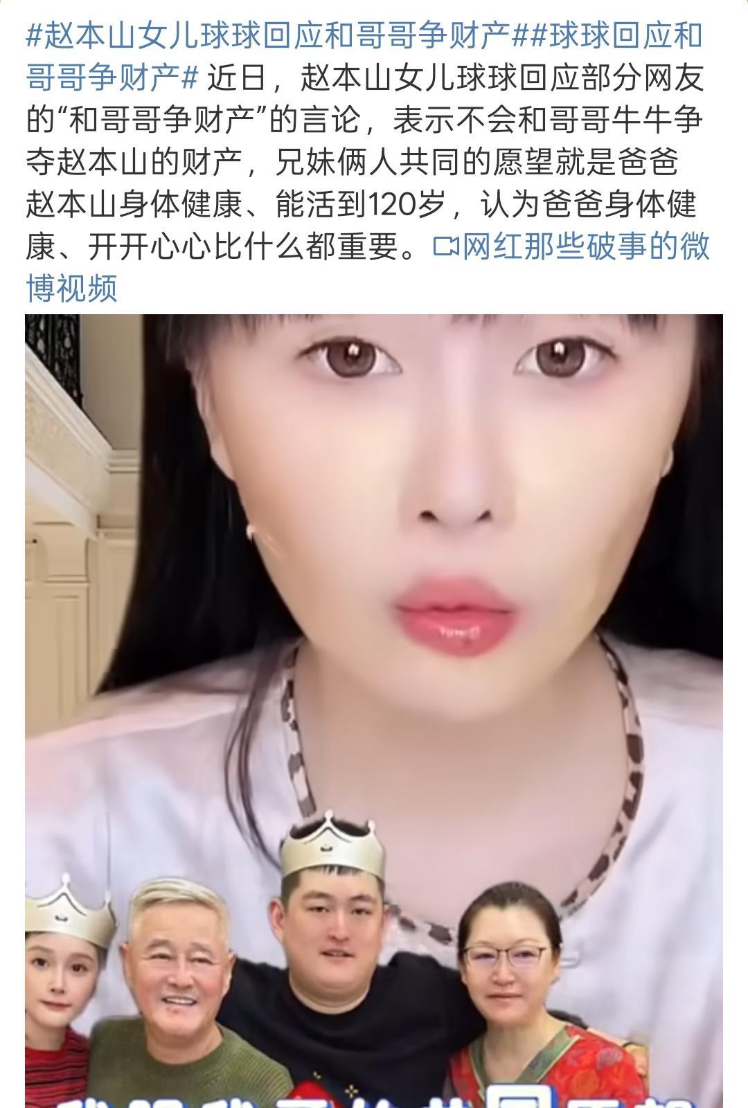 赵本山女儿球球直播回应,否认与哥哥的财产争议传闻! 近日,赵本山女儿球球在直播中公开回应了与哥哥赵一楠的财产争议传闻。球球明确表示,兄妹二人从未因财产产生过矛盾,此类猜测“完全不存在”。 她强调,自己和哥哥的共同愿望就是希望爸爸赵本山能活到120岁,身体健康比任何财产都重要。 并在直播中反问网友:“如果你作为儿女总惦记父母的钱,不觉得是自己的失败吗?” 至于球球在直播中说的是不是真话?这个我们也不确定。毕竟赵本山的家产到底有多少?这个谁也不知道,但我觉得最起码几十亿往上了吧! 另外人常说打江山容易守江山难!不管是球球,还是儿子,我觉得都没有能守住这份家产的能力更别提往上发展了。 入了山海关,有事找本山!这话一般人谁能驾驭的了? 他的儿子我觉得没这个能力吧! 做的好了,衣食无忧一辈子,只要不败坏家产就可以。