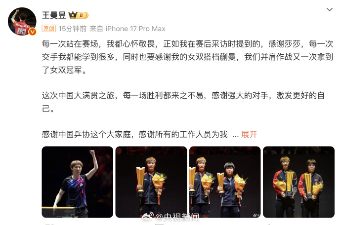 #王曼昱赛后发博#【#王曼昱感谢莎莎蒯曼#】WTT中国大满贯,#王曼昱2冠#。