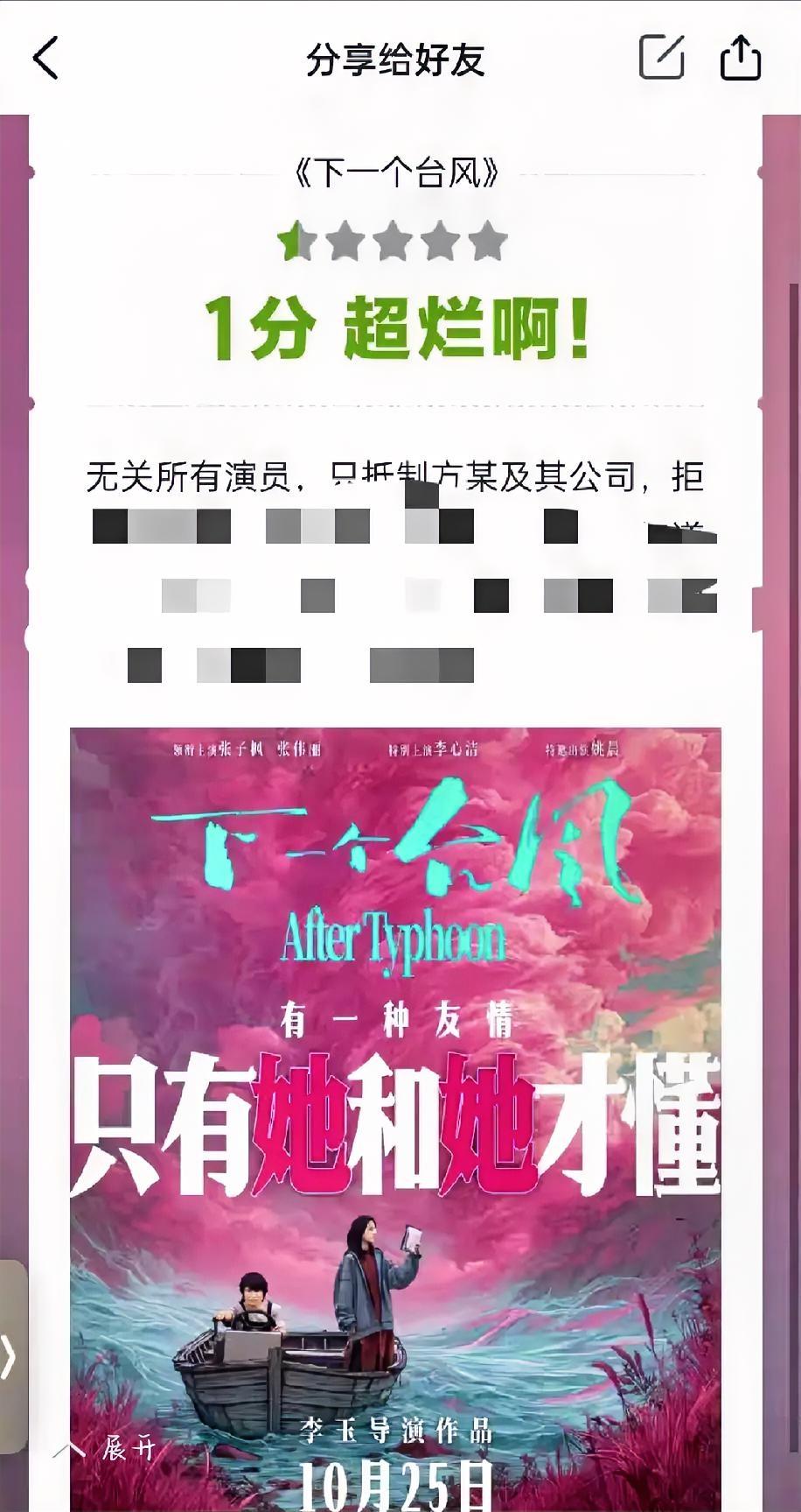 导演李玉没有想到, 在宣传海报上已经隐去了编剧方励的姓名, 没想到还对被打这么低分。 这部让她揪心的电影是《下一个台风》,10月底才上映,试映场评分就跌破及格线,豆瓣短评区满是“剧情散乱”“人物立不住”的吐槽。 她和方励搭档十七年,从《红颜》到《观音山》,早就成了观众眼里的“黄金组合”。这次隐去名字,明眼人都看得出是想切割——方励近期深陷舆论漩涡,刚因造谣争议报了警。 可观众根本不吃这一套。有人在影评里直戳要害:“我们骂的是故事里四个女人的线拧成一团乱麻,跟谁的名字在海报上没关系。” 这话戳中了关键。当年《断·桥》口碑滑坡,也不是因为演员,而是结尾“拿到U盘不报警”的剧情BUG,让观众满脑子问号。李玉那时说“人性复杂”,还暗讽观众“生活太幸福看不懂”,早伤了路人缘。 这次《下一个台风》重蹈覆辙。有提前看片的影迷说,台风灾难背景铺得很大,结果后半段全在扯家长里短,灾难的冲击力半点没体现。 隐去方励的名字,反而显得欲盖弥彰。毕竟熟悉他们的观众都知道,两人合作向来是方励搭框架、李玉填细节,剧本问题不可能是单个人的锅。 影院里坐我旁边的大姐看完直摇头:“之前《观音山》里范冰冰演的南风多鲜活,现在这几个角色,哭也哭得不真切,笑也笑得没底气。” 李玉大概忘了,观众进影院是为了看能共情的故事,不是看主创玩“署名消失术”。方励的争议或许会影响初始期待,但最终打分的标尺,永远是电影本身的质量。 要是把藏名字的心思花在磨剧本上,像当年打磨《观音山》那样反复调整人物逻辑,也不至于落得“浪费题材”的评价。毕竟观众的宽容度,从来给的是真诚的创作,不是投机的公关。 各位读者你们怎么看?欢迎在评论区讨论。
