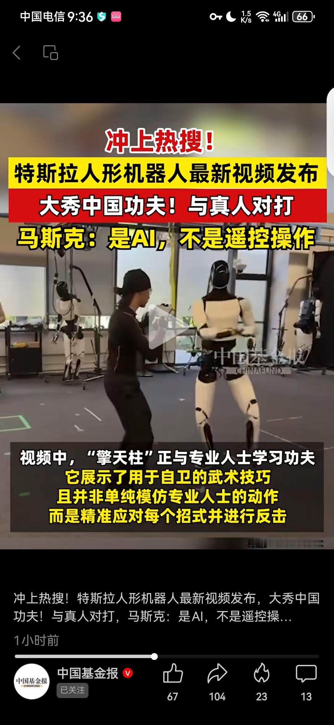 这两天,马斯克的科技成果,再次震撼了全球。 根据中国基金报10月5日报道,马斯克刚刚发布了他研制的擎天柱机器人的最新视频,在视频中这个擎天柱机器人竟然大秀中国功夫,跟一个真人有来有回的对打,姿态稳定、动作流利,虎虎生风,敏捷程度简直丝毫不下于人类。 而且,更加重要的是,除了这个流畅的动作之外,这个擎天柱机器人最惊人的一点在于,它并不是遥控操作,是纯粹由AI驱动的,也就是说,它做出的一切动作,都是它体内的AI系统,自主进行控制,马斯克在推特上亲自回复了这一点。 这就太惊人了。 用AI系统控制的机器人,现在竟然能够做到这样流畅敏捷的动作,与真人打得有来有回! 因此,这个视频一发布,就立刻火爆全球,因为这当中蕴藏的技术含量,实在是太高,几乎可以说又使得人形机器人行业往前走出了一大步!做出了一个巨大突破! 只能说马斯克真的是神人,他一旦还是专注于研发科技,简直就好像是开挂了一样,不管做什么都能够迅速巨大突破,新能源电动车,SpaceX,脑机接口,AI,等等技术,都是如此,现在,又来了一个机器人! 相信,按照这个速度继续发展下去,恐怕要不了多久,人形机器人就真的能够走进千家万户,成为陪伴在我们生活中的一员了。