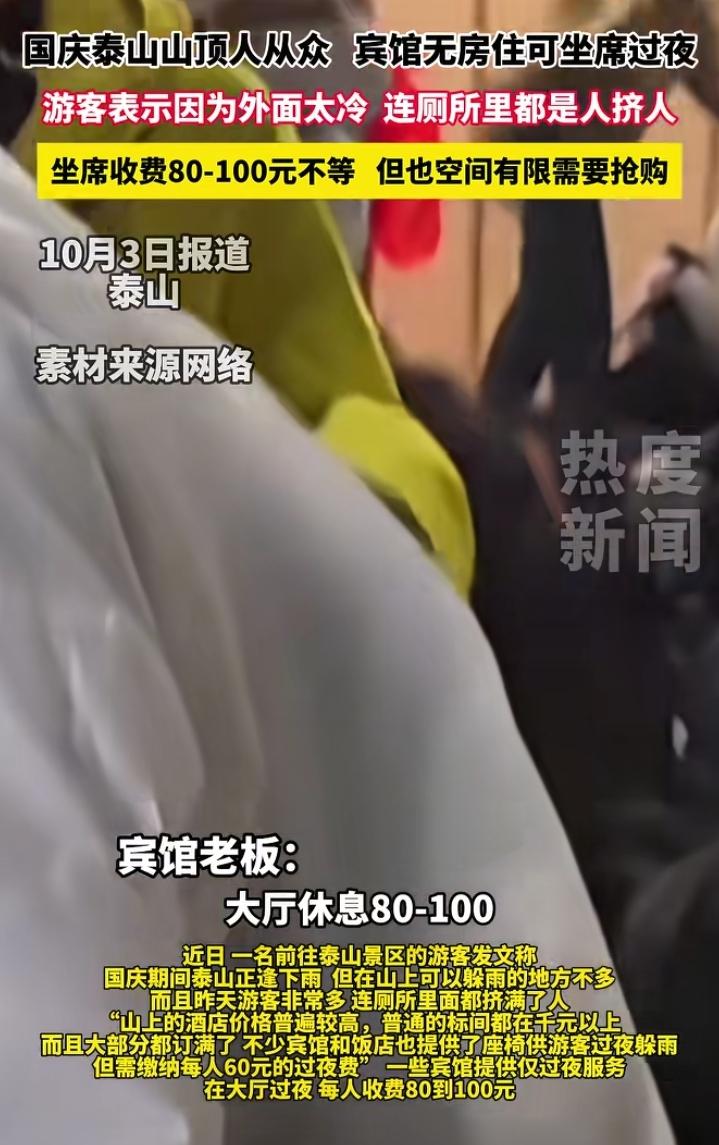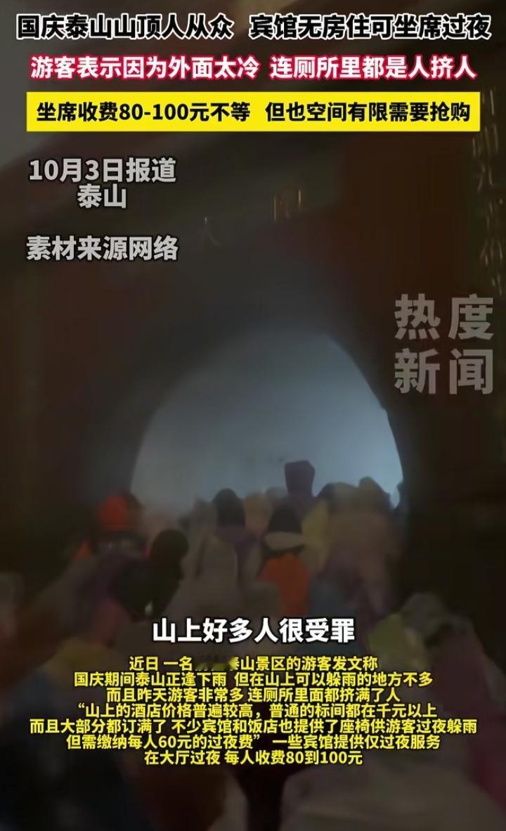 赚翻了,大厅过夜每人收费80到100元,生意却好得不行。 国庆期间,由于天气炎热,很多人选择爬山,寄情于山水,而泰山成为很多人的选择,俗话说不到泰山非好汉,殊不知国庆期间的好汉可不好当,因为人实在是太多了! 泰山山顶形成人从众之势,由于天色已晚,还下着雨,很多人不得不在泰山逗留一晚,本来想着打开手机订个房间住,没想到纷纷爆满,而室外温度低,没办法只能在饭店和宾馆大厅凑合一晚了,饭店和宾馆的老板似乎嗅到了商机,普通的单间普遍千元以上,就连大厅一个“过夜位”也要收80左右,简直是一周赚一年的钱! 对于这种商业行为,符合市场供不应求的特征,但心里却过不了这道坎,要我是游客,有了这么一次经历,估计以后都不会去了,虽然钱花得不多,但总感觉被“宰”,感受不到人与人之间的温暖,难道宾馆和饭店提供一个免费的过夜位这么难吗?或者说能不能别收费这么高!这简直是把利益至上演绎得淋漓尽致,游客心里会怎么想? 个人感觉每逢节假日就涨价的行为真的有点投机倒把,涨一点能理解,成倍几倍的涨就有点说不过去了,这跟宰客没多大区别,对此您怎么看?有没有类似的经历,欢迎讨论交流。