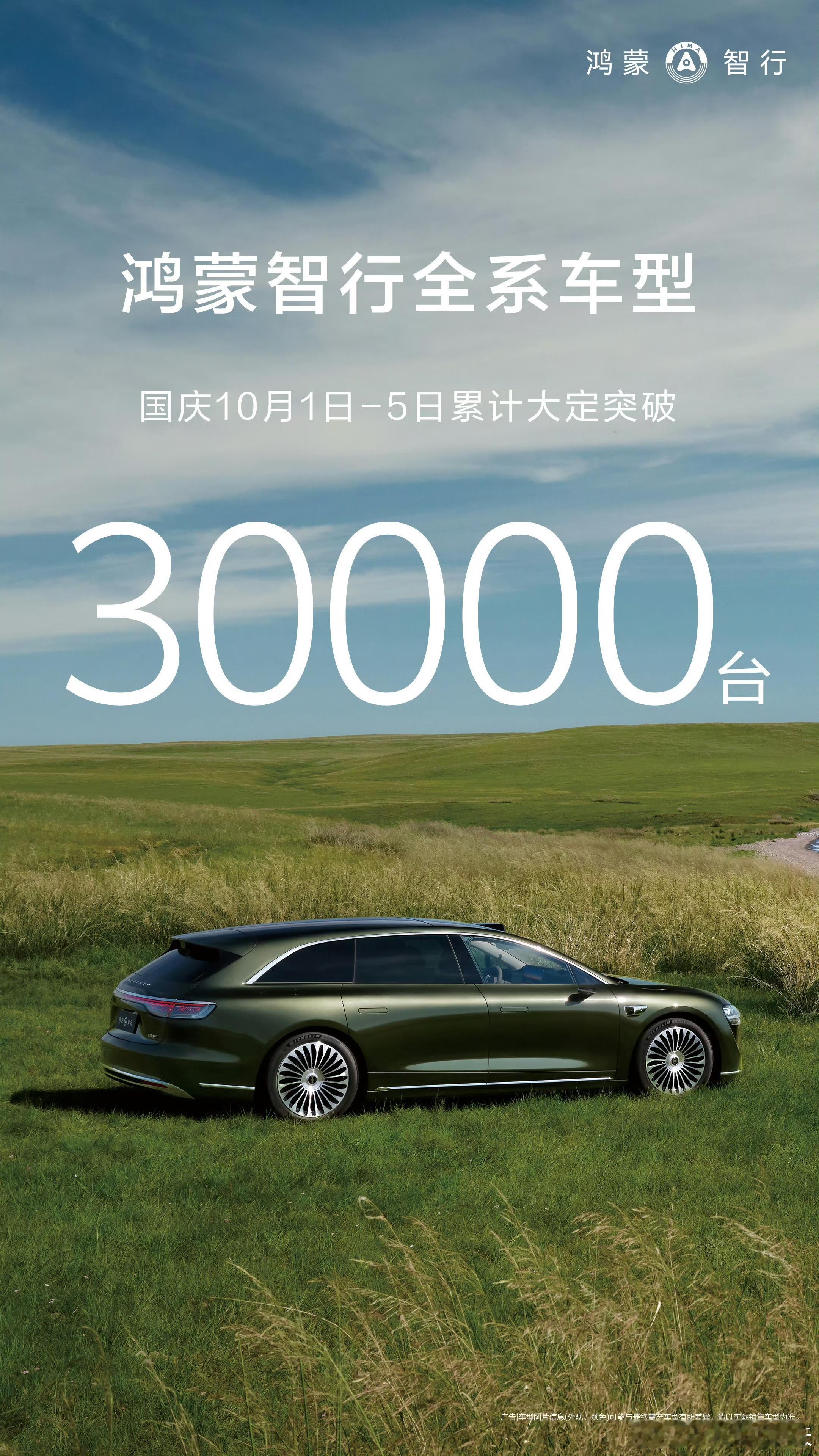 鸿蒙智行国庆10/1 - 10/5 累计大定突破 30,000 台,其中: