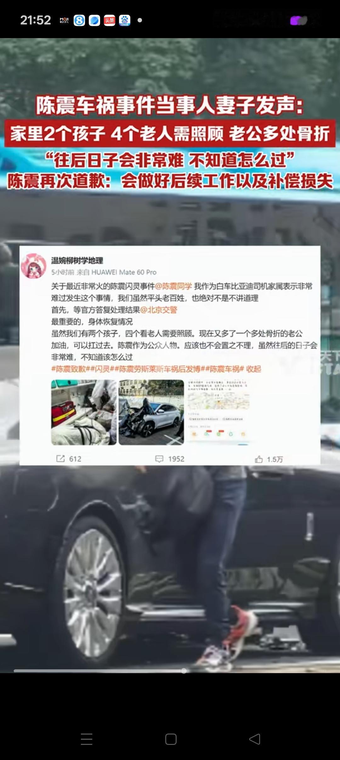 现在全网最愁的就是陈震了吧, 本来只是一起普通的交通事故! 但现在当事人妻子,却发声卖惨:说自己家里有2个孩子,4个老人要照顾,显然是想尽可能的多得到补偿。 其实也能理解,毕竟老公骨折了,要休息一段时间,一家人没有收入来源。 好在陈震也及时回应:真诚道歉并表示会做好补偿! 这个事,陈震从头到尾都态度端正,说一切按照流程来,显然是想该赔多少就赔多少。 但现在家属这个回应,不知道他是否会考虑多给一些,给自己加一些印象分呢? 毕竟对于他来说,可能也就是一个视频的钱。。