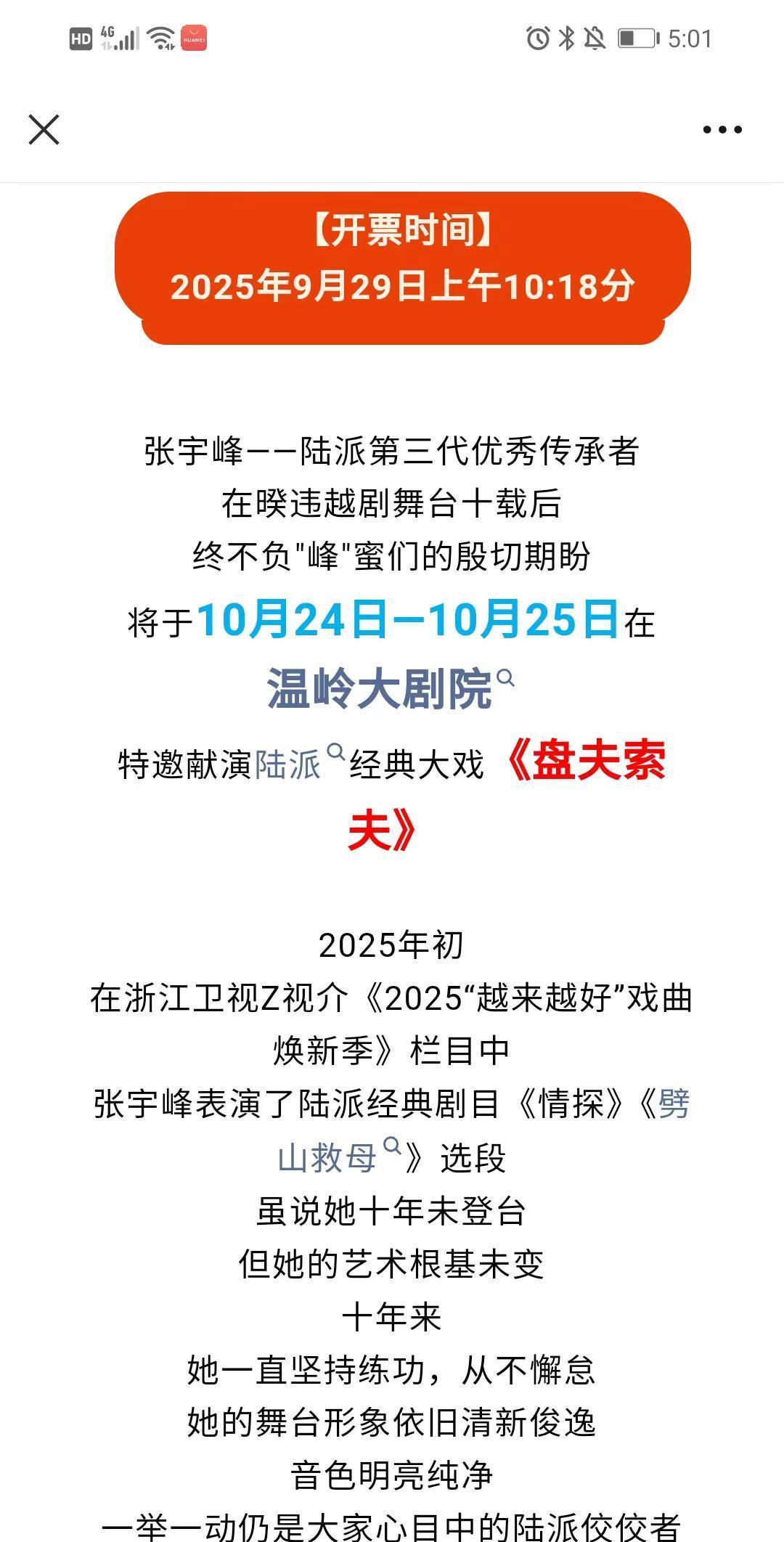 张宇峰一开票,90万没了。 1800个座位,24小时清空,连山顶位都抢成春运。 十年没登台,一回来,越剧圈直接炸了。 他不是一个人在演戏。 自带鼓师、胡琴、老行头,连锣鼓点都照着1982年电影版一拍一板复刻。 华怡青亲自下场教新人,删掉冗长唱段,加一段【弦下调】慢板——不是怀旧,是给年轻人搭梯子。 政府敢掏钱了。 票房不够七成,补贴三成,上限五十万。 民营院团第一次吃上“风险补偿”的螃蟹,不是靠情怀撑场,是用机制兜底。 抖音1.2亿播放,闲鱼代抢价飙到300一张。 温岭民宿预订率七成八,老板笑得合不拢嘴。 戏迷不是老一辈的专利,是年轻人在刷屏、在抢票、在追一个十年没露面的“老演员”。 他没说 comeback,只说“身体允许,就慢慢磨《珍珠塔》《碧玉簪》”。 2026年还要上交响版,中央民族乐团伴奏。 不是复出,是重启。 越剧的根没断,只是有人,悄悄把它重新擦亮了。