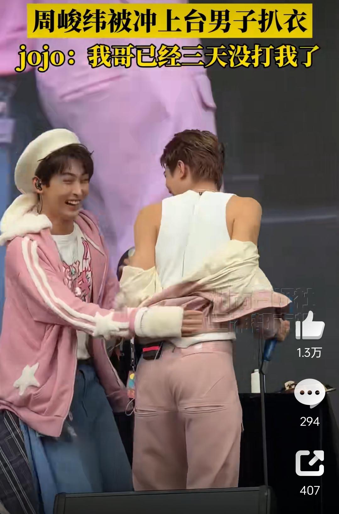家人们!常州太湖湾音乐节惊现“突袭名场面”!周峻纬正好好表演呢,突然冲上来个男的伸手扒他衣服,现场粉丝都吓懵了! 结果下一秒反转笑喷——这男的居然是唐九洲!合着是好兄弟来“搞事情”,专门给粉丝谋福利来了!周峻纬又惊又笑的反应也太可爱,网友直接调侃:这哪是扒衣,明明是唐九洲的“宠粉突击”,下次能不能提前打个招呼啊!