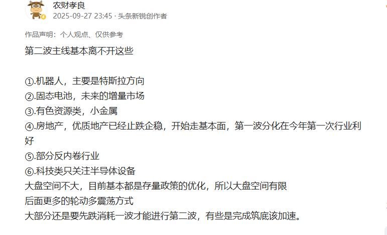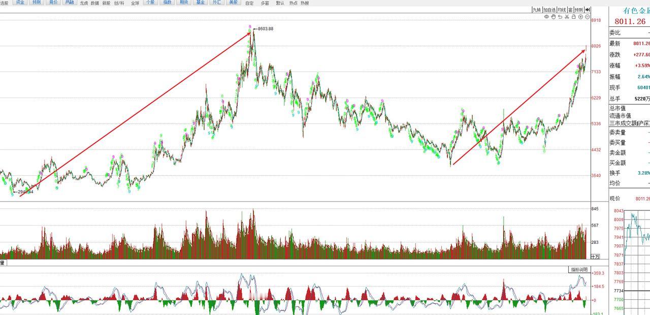 有色金属和小金属的行情比19年开启的行情还要大 具体形象化比较,18年第四季度的底部到2021年的时间周期,三年趋势性行情。 当下有色金属的行情,时间周期要大于上一波的。高度自然是那一波的2倍以上。 上一波铝占头角,这一次铜会领先。目前有色金属还没进入到加速行情, 什么是加速行情呢,就是前段时间的易中天的那种加速。 9月27号深夜就说了,二波的主要方向之一,有色金属。 这个逻辑非常简单,可以列举一下: ①.黄金白银走了超级大牛市,也是降息周期的结果,铜自然而然的就是跟随。 ②.本质还是供求关系的影响,之前消费电子和新能源大都采用金属铝或相关的铝合金,带动了上一波有色金属铝的大行情,这一次铜的需求主要在于机器人行业的增量,良好的导电性、延展性和耐腐蚀性,需求较大,据不完全统计,铜的需求年复增长超30%。 ③.这个和我们相关,就是中国经济的复苏,低谷到恢复正常,资源类大都能来波牛市,目前这一逻辑还未发生,因为大部分资源类还未涨,所以现在的逻辑主要是前二。但③的逻辑肯定会发生,明年A股将会有加速行情,肯定会触发。 有色金属还有小金属锂,主要是固态电池领域,可能纯金属锂的不行,必须是全产业链的才好。特别是终端产品上的。等下次说固态的再展开吧。 不用大涨去追,以上一波金属铝为例,5波行情,换句话说就是有很多低吸的机会的,只要没有加速大涨那后续肯定有波大涨的机会。2块多,到二十二块多,10倍行情,金属铜是要出现20-30倍的大牛的。 可以比较05年到08年的那波超级大牛市。 综合就是,未来的主要方向之一吧。好几波呢。 当然这是我个人的观点,不具有投资建议,每一波的顶就要重点分析, 超级大牛市的主要特征就是造顶不是出货,而是洗盘,所以跟踪顶就知道下波的高点了,所以是件很有趣的事情。