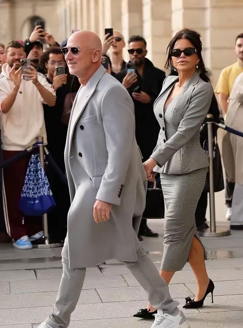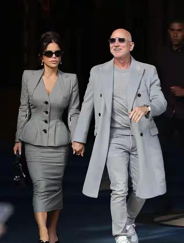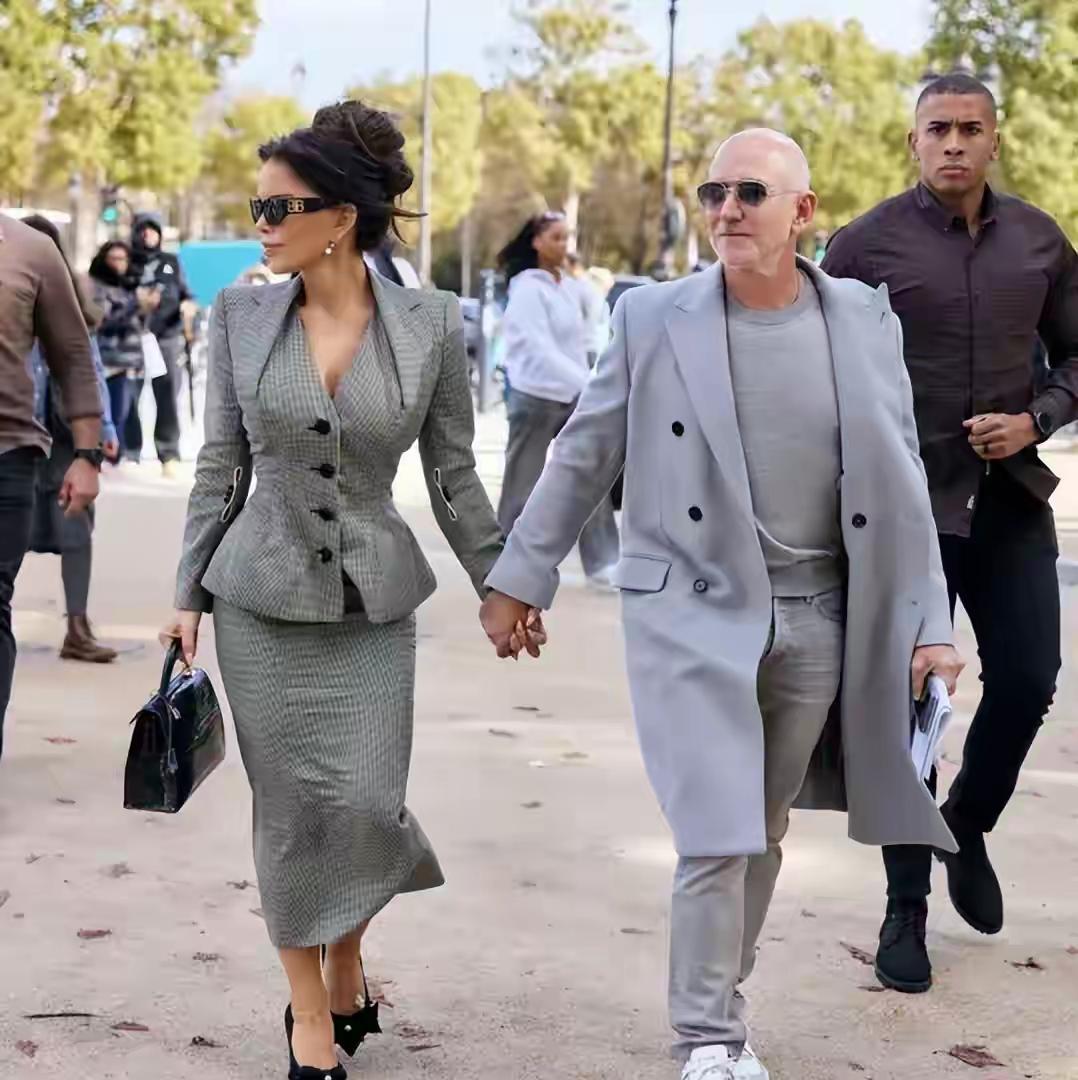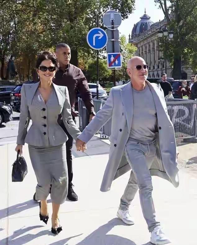 杰夫·贝索斯与新婚妻子劳伦·桑切斯手牵手步出酒店,奔赴时装周现场。两人默契选择灰
