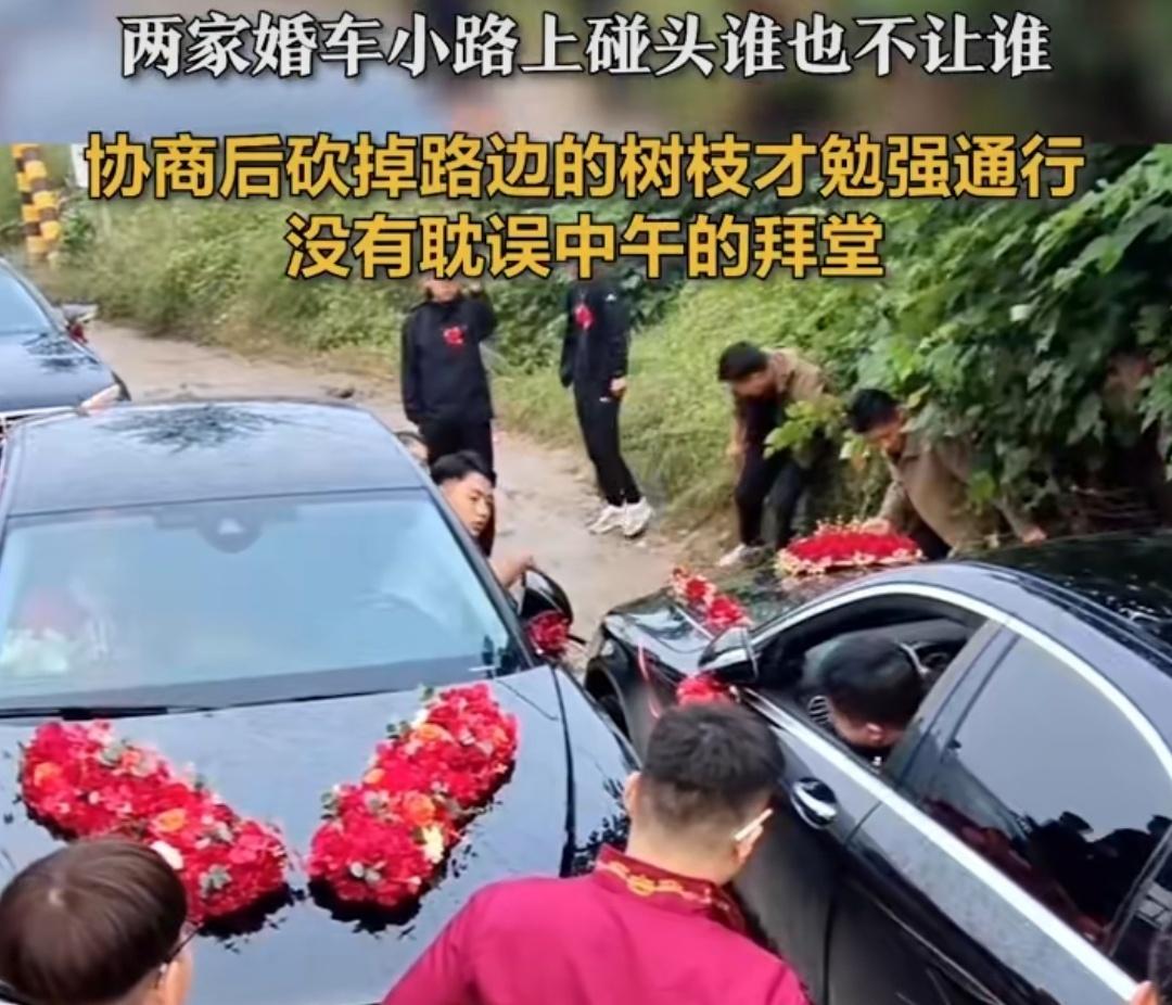 两辆婚车狭路相逢,为“吉时”互不相让,最终竟砍树通行。这砍掉的不仅是路边林木,更