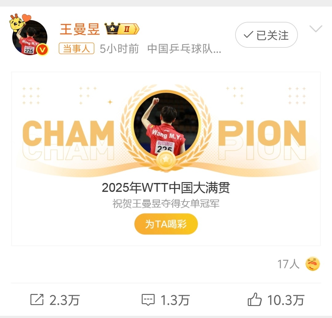 王曼昱4比2战胜孙颖莎,恭喜鳗鱼,只要冠军属于中国队,对我们来说都一样。