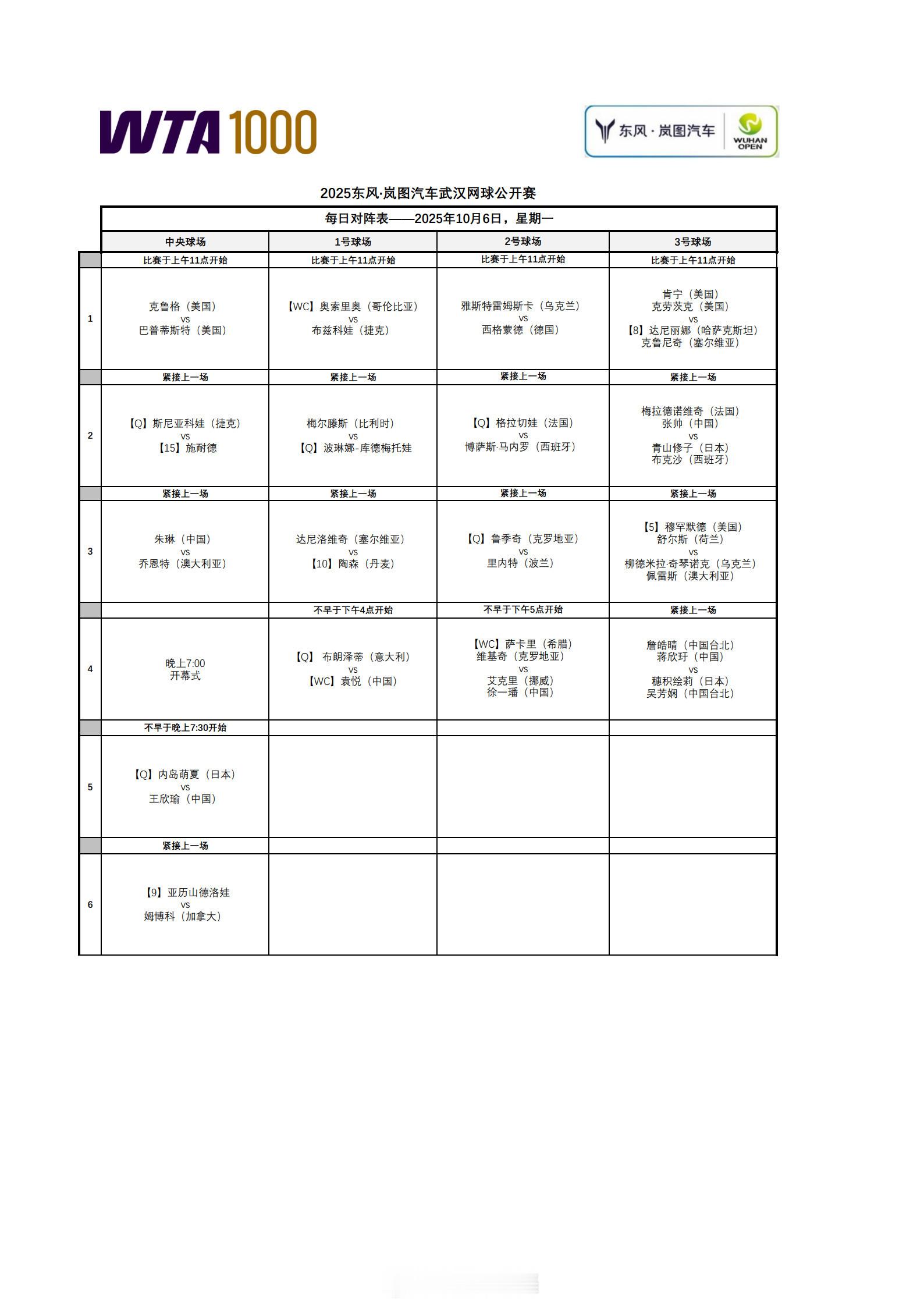⏰10月6日:三位中国金花携手出战,去年武网四强王欣瑜19:30坐镇中心球场将迎战内岛萌夏;朱琳14:00与乔恩特交锋,袁悦16:00对战布朗泽蒂