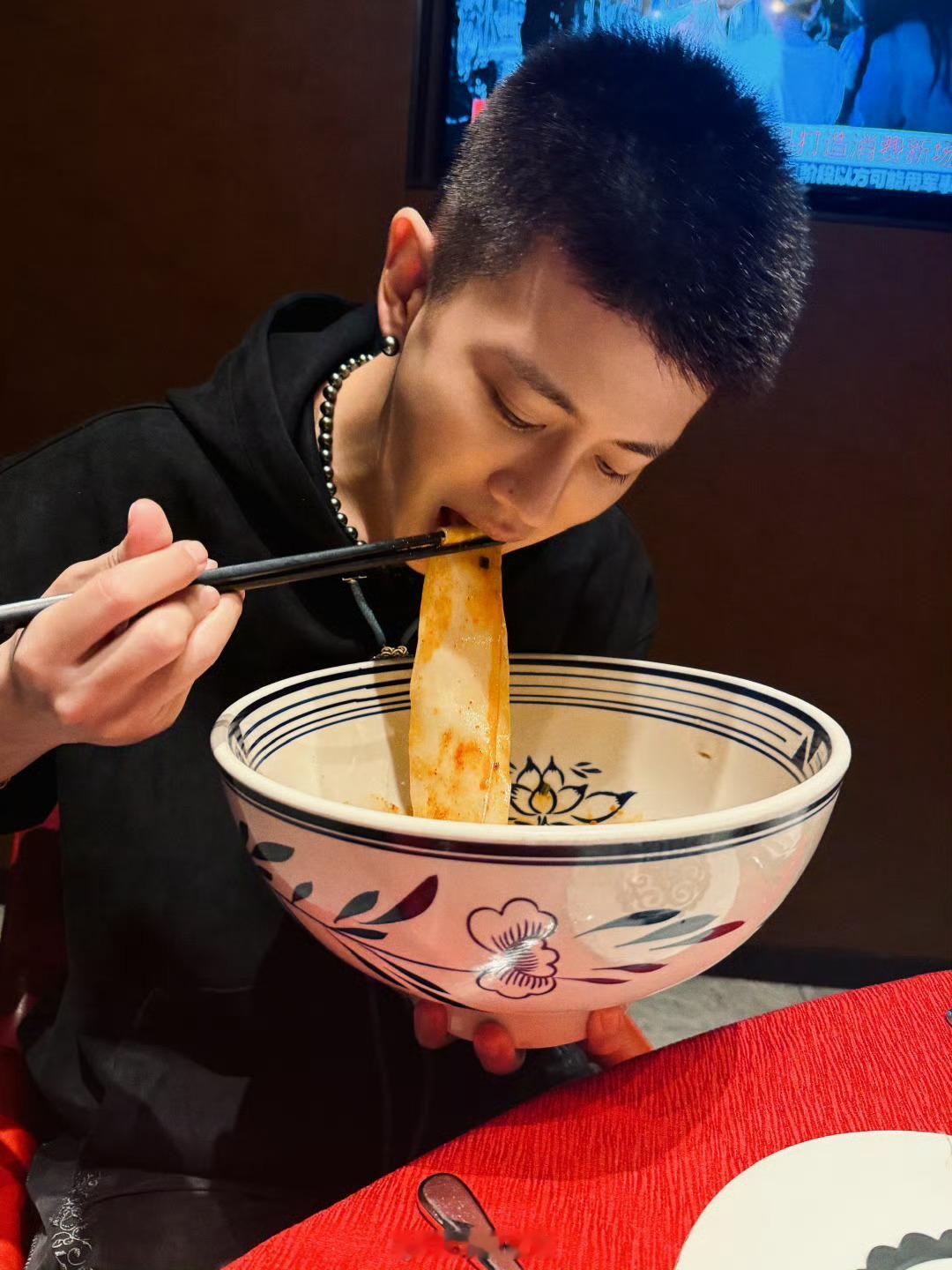 任嘉伦挑战巨无霸碗面~新鲜小溜达,一个天天充满新鲜感的超,好可爱[期待]我也未吃过那么阔的面[馋嘴]我请问他吃的是什么面,油泼面吗?嘉伦吃的好香,好想吃[拜托] 这么大的碗我差点以为是Al