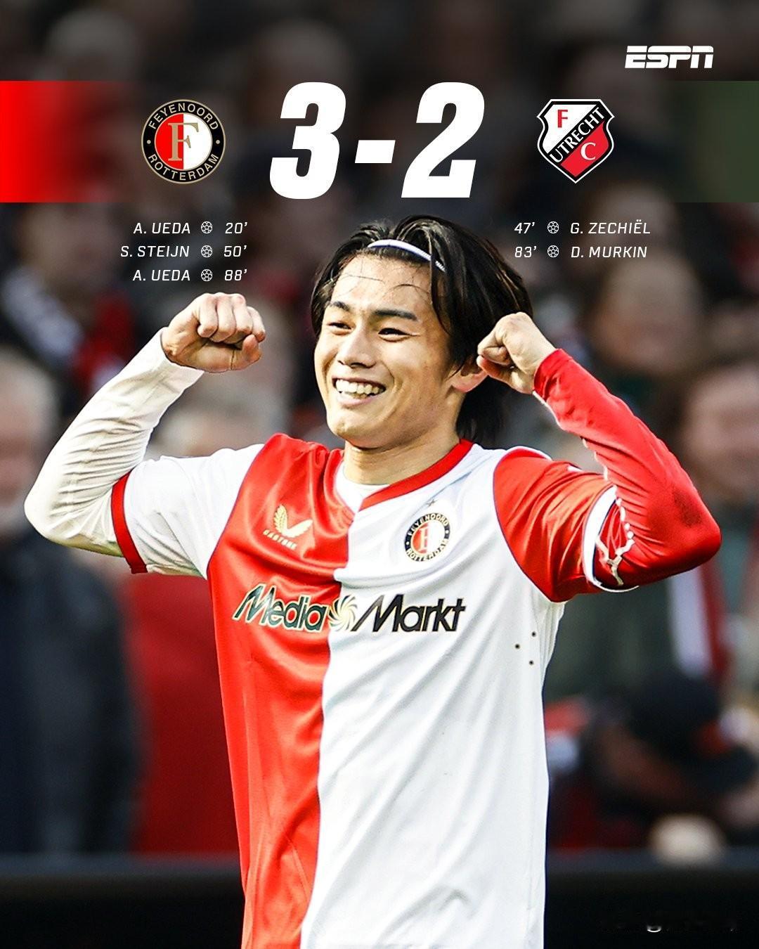 亚洲第一球星,上田绮世在荷甲上演绝杀领跑荷甲金靴! 在刚刚结束的一场荷甲比赛中,日本球员上田绮世上演梅开二度的精彩表现, 还上演了终极绝杀,带领费耶诺德3-2险胜乌得勒支,以7胜1平的不败战绩,继续领跑积分榜。 上田绮世绝对是本赛季亚洲第一球星,本赛季在荷甲联赛中8场比赛打进8球,领跑荷甲金靴榜,要不是已经27岁的话,早就被五大联赛的豪门疯抢了。 不得不说日本球员真的是太让我们羡慕了,在欧洲联赛竟然表现如此出色,我们要是有如此天才的球员,何愁国足进不了世界杯呀。