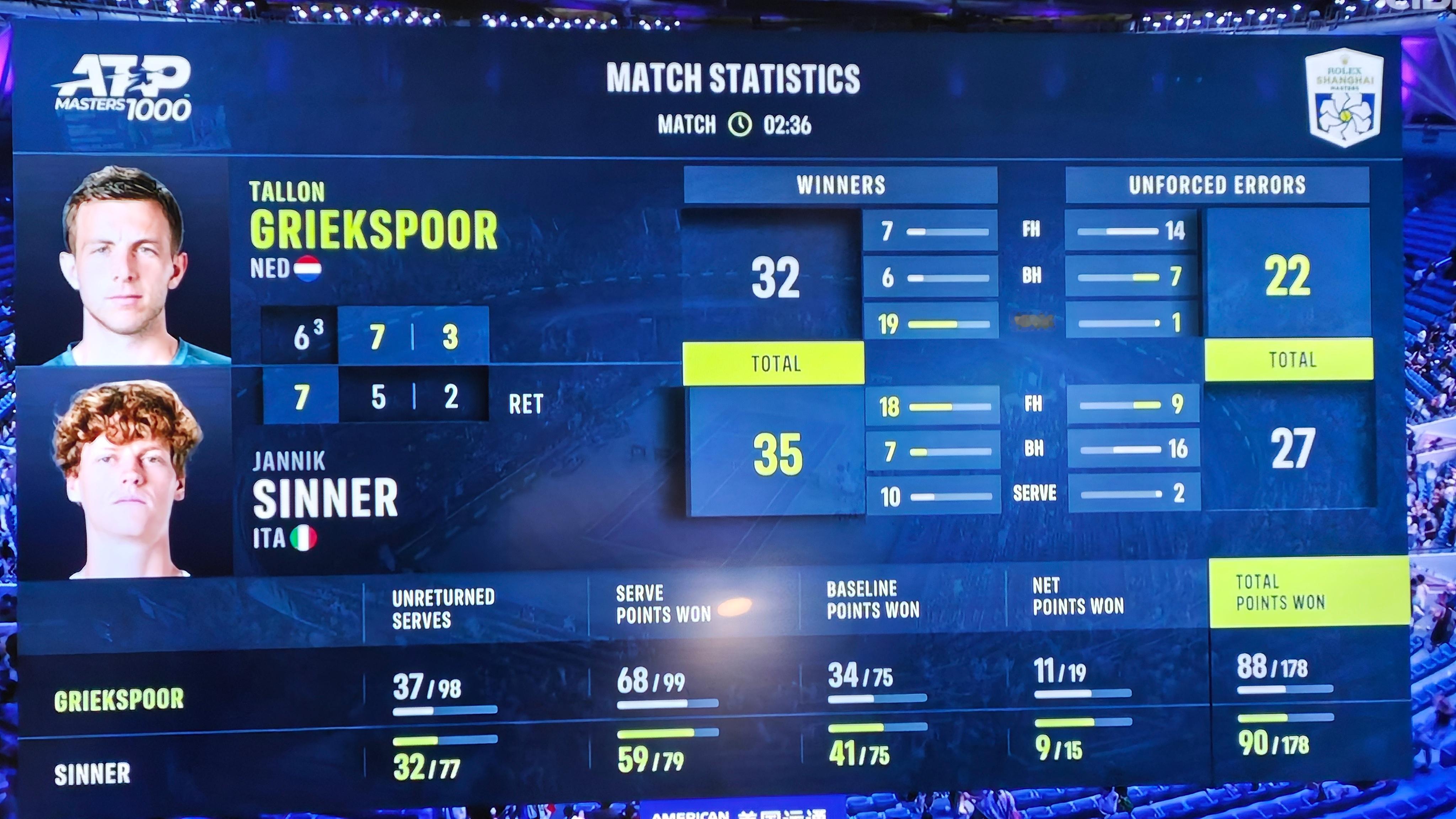 头号种子辛纳与格里克斯普尔战至决胜盘,因为腿部伤势,实在无法坚持遗憾选择退出比赛🍂