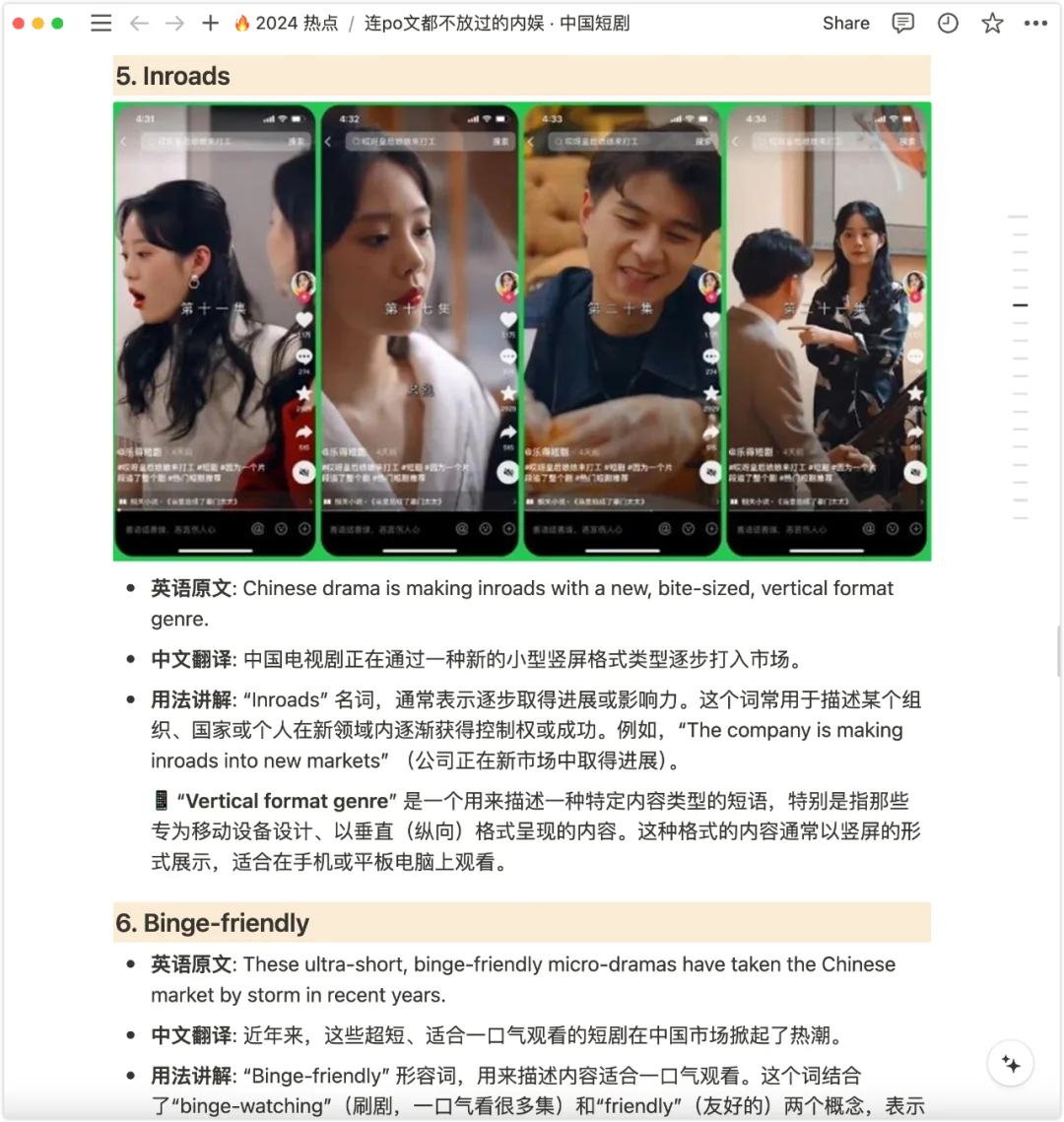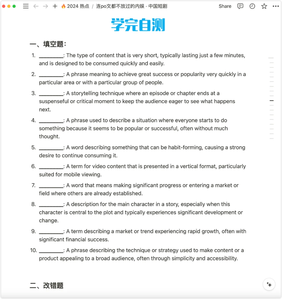 📑 重点词汇和地道表达学习,完整版8个知识点和词汇填空、改错、阅读题,见外刊文件夹- 热点报道。【中国短剧】【17页】