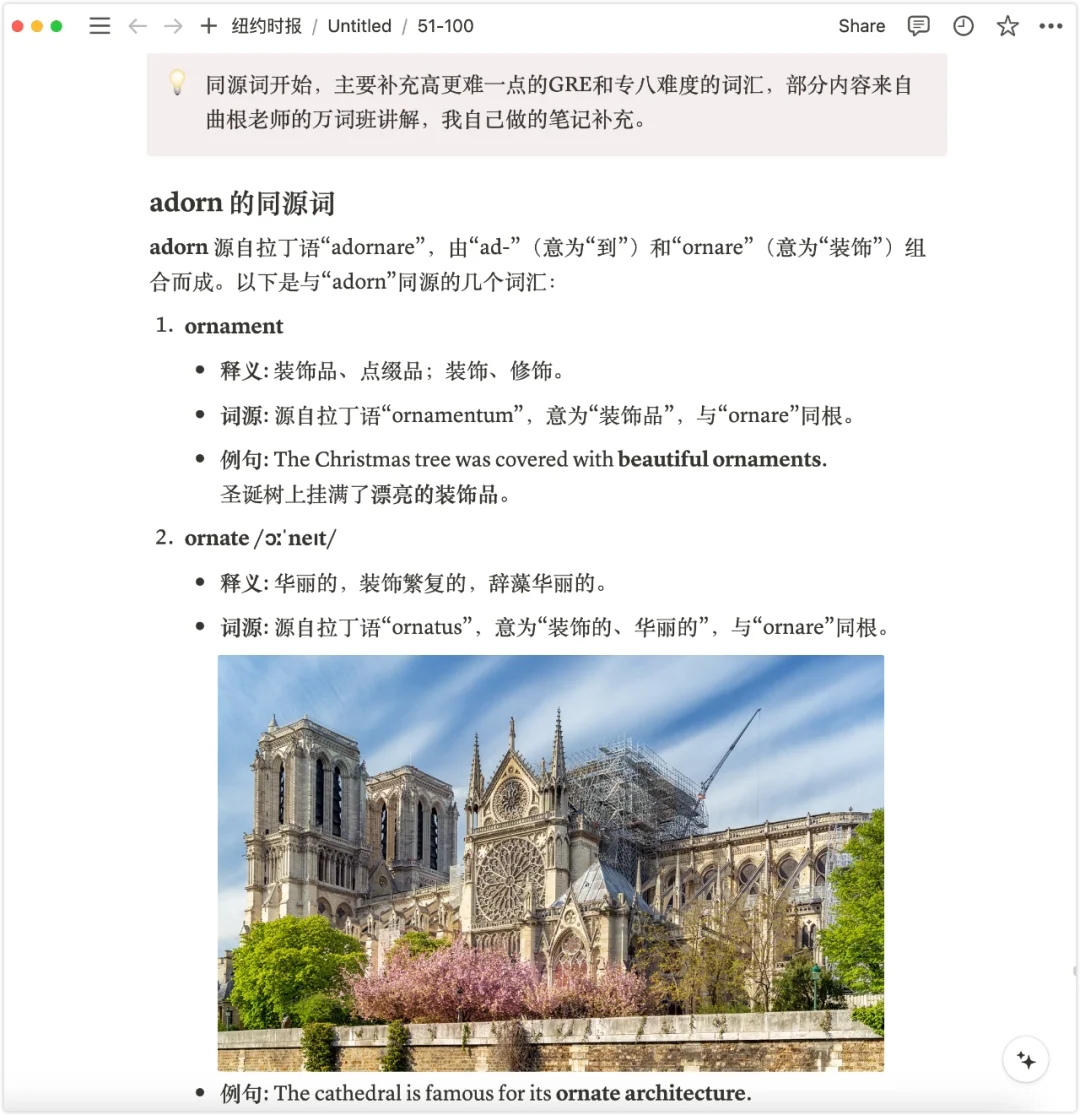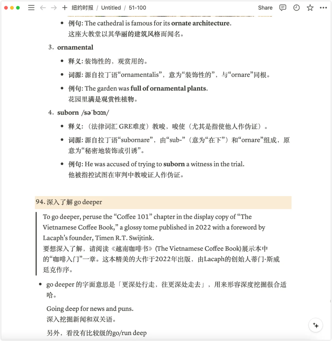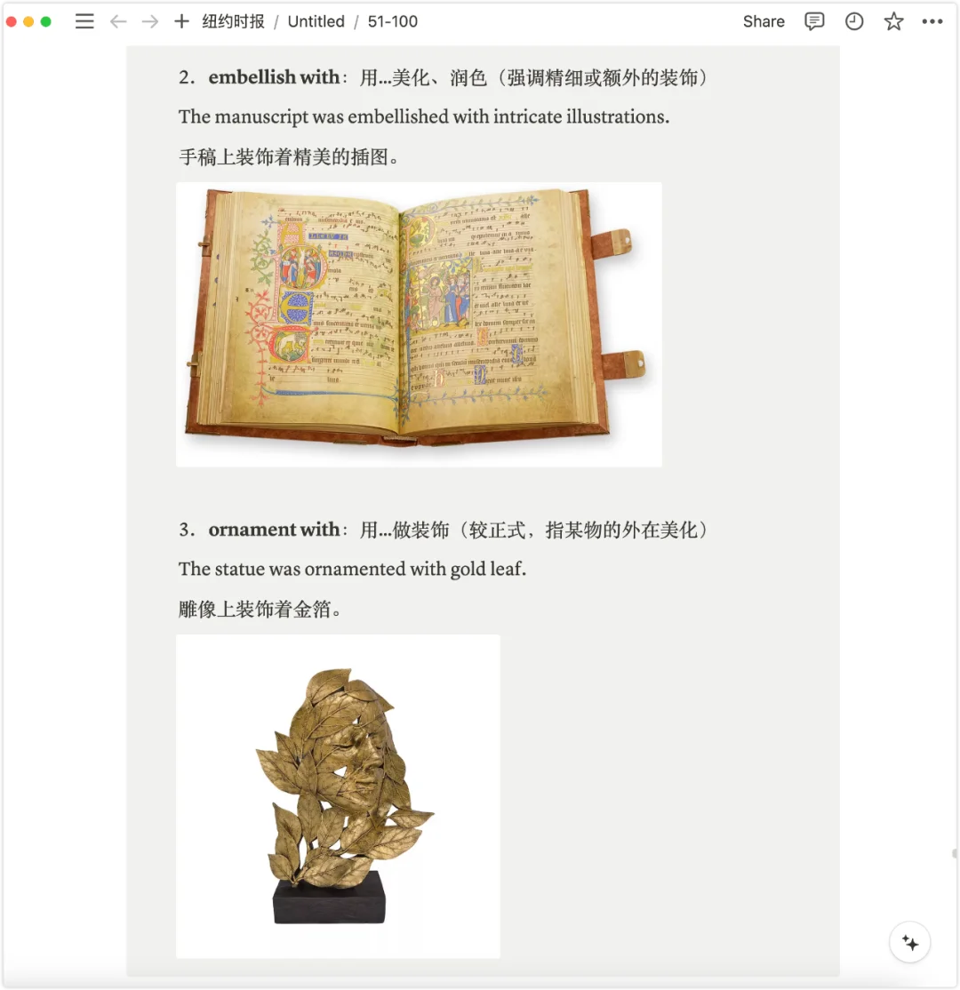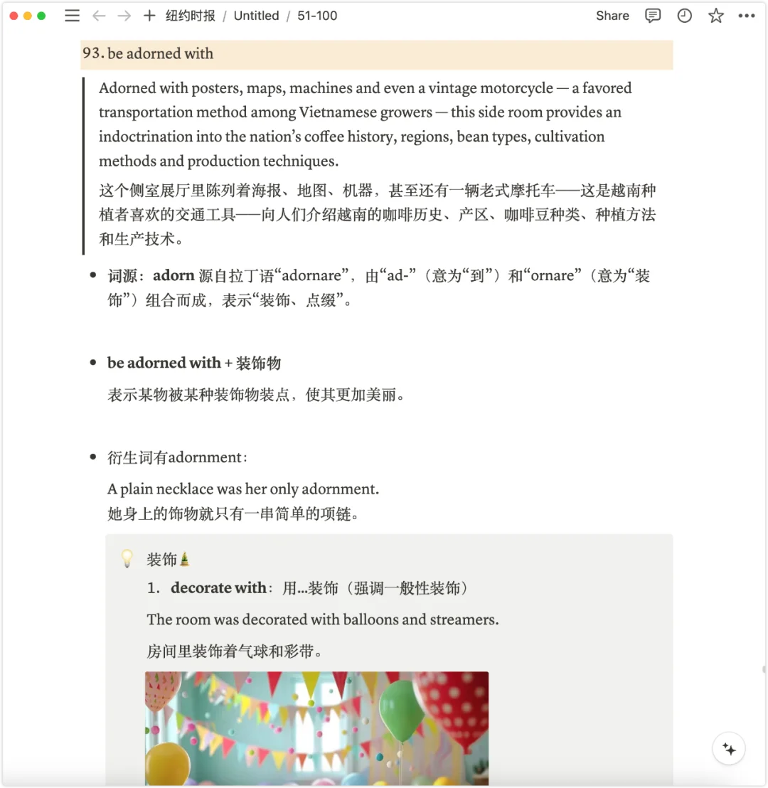 📜 学会翻译: 1. 老式摩托车 a vintage motorcycle 2. 装饰、点缀 be adorned with 3. 漂亮的装饰品 beautiful ornaments 4. 喜欢的交通工具 a favored transportation method 5. 强行灌输 provide an indoctrination into 6. 种植方法 cultivation methods 7. 深入了解 go deeper 8. 仔细阅读 peruse something 9. 精美的大作 a glossy tome 10. 由谁作序 a foreword by ✅ 外刊专题 · 纽约时报 · 完整版 51-100 【共102页】