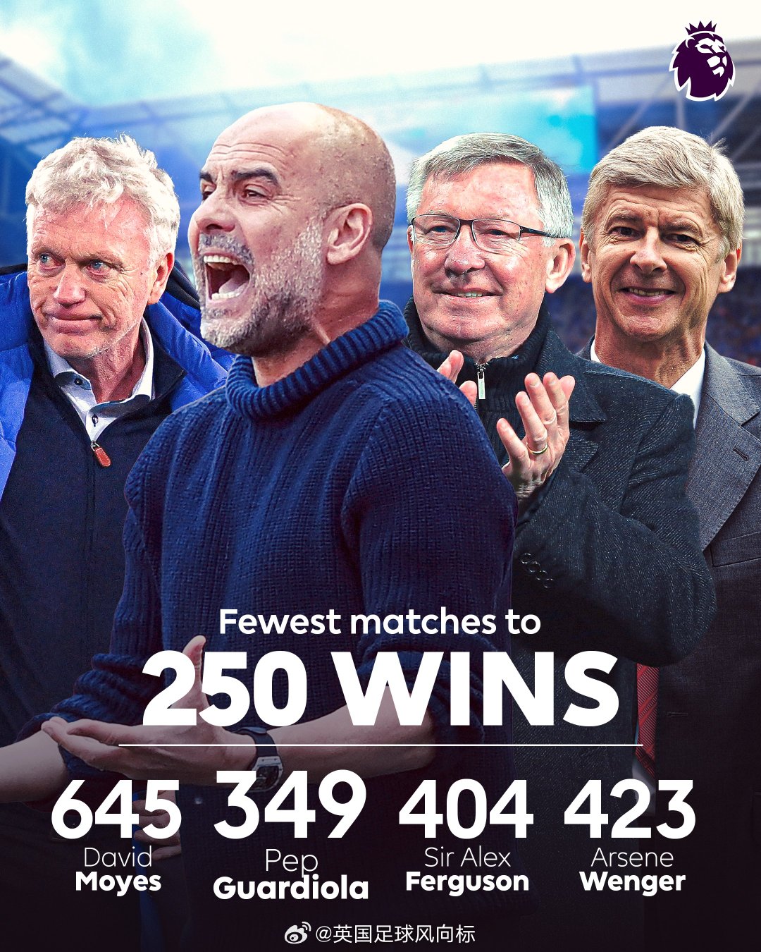 【瓜迪奥拉英超250胜】布伦特福德0比1曼城,瓜迪奥拉成为英超史上最快达到250胜里程碑的主帅,他花了349场英超比赛就拿到250胜,而弗格森爵士、温格和大卫-莫耶斯,分别是404场、423场和645场。 ​​​