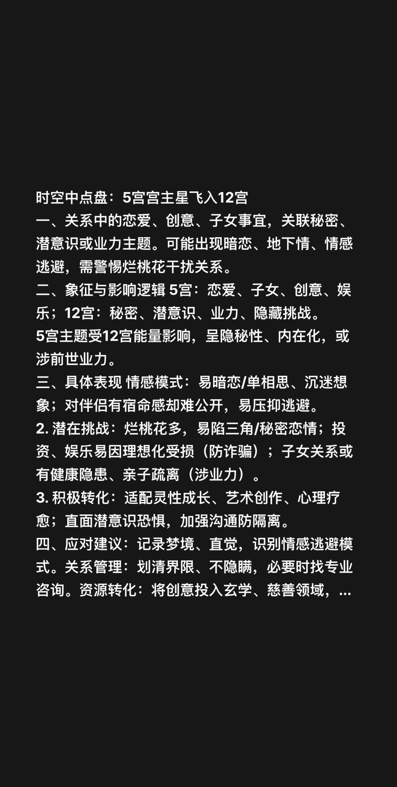 时空中点盘:5宫宫主星飞入12宫 一、关系中的恋爱、创意、子女事宜,关联秘密、潜意识或业力主题。可能出现暗恋、地下情、情感逃避,需警惕烂桃花干扰关系。 二、象征与影响逻辑 5宫:恋爱、子女、创意、娱乐;12宫:秘密、潜意识、业力、隐藏挑战。 5宫主题受12宫能量影响,呈隐秘性、内在化,或涉前世业力。 三、具体表现 情感模式:易暗恋/单相思、沉迷想象;对伴侣有宿命感却难公开,易压抑逃避。 2. 潜在挑战:烂桃花多,易陷三角/秘密恋情;投资、娱乐易因理想化受损(防诈骗);子女关系或有健康隐患、亲子疏离(涉业力)。 3. 积极转化:适配灵性成长、艺术创作、心理疗愈;直面潜意识恐惧,加强沟通防隔离。 四、应对建议:记录梦境、直觉,识别情感逃避模式。关系管理:划清界限、不隐瞒,必要时找专业咨询。资源转化:将创意投入玄学、慈善领域,转化业力。