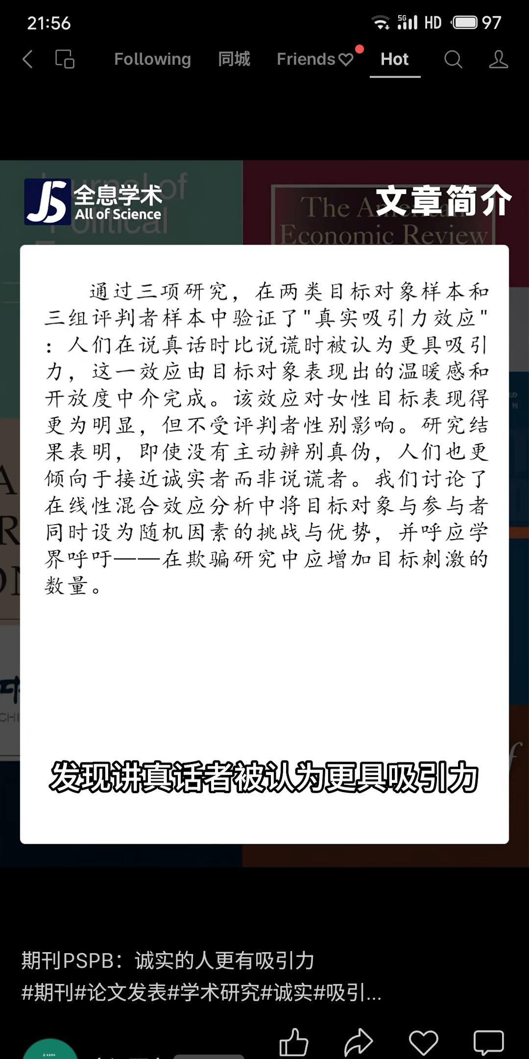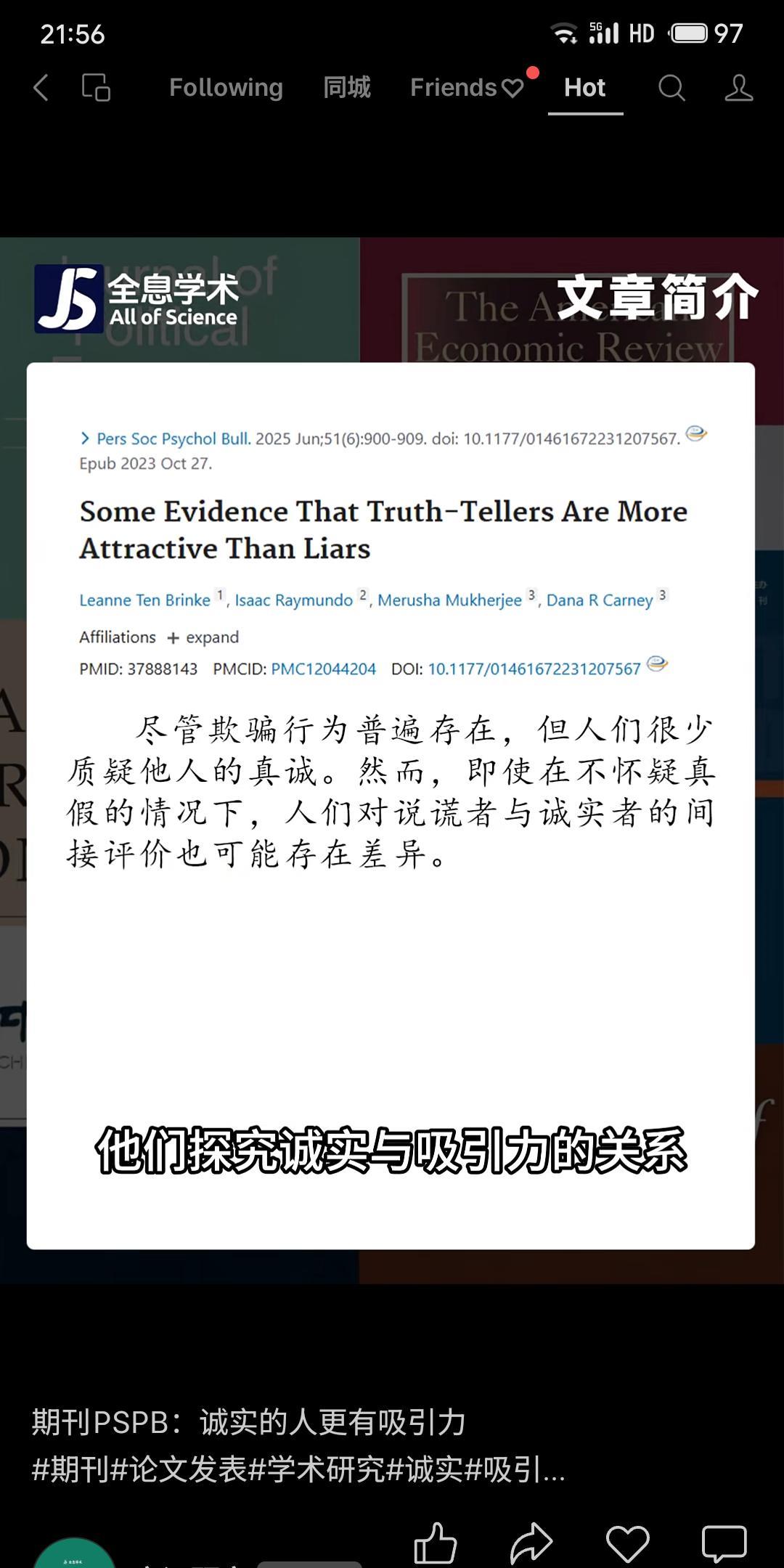一项发表于《人格与社会心理学通报》的研究表明,诚实的人通常更具吸引力。该研究通过三项实验发现,人们在说真话时,因表现出更高的温暖感和开放度,而被认为比说谎时更有魅力。这种“真实吸引力效应”在女性中更为明显,且不受评判者性别影响。