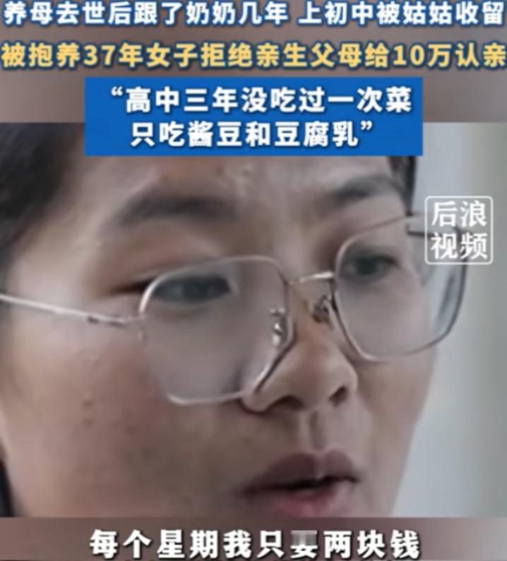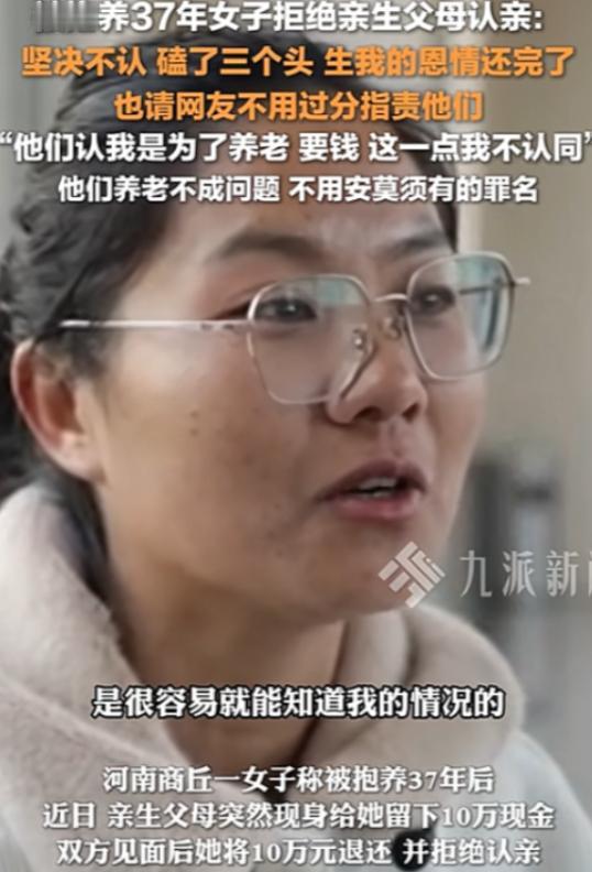 “凭什么要我养!”2024年,女子9岁时养父母去世,只能跟着奶奶、姑姑生活,高中寄宿3年没吃过菜,每星期只敢要2块钱生活费,上大学时姐夫扛钢筋,每月打给她300块,生父生母就在眼前,却根本没有帮过她! 大家最近是不是被河南商丘这位被抱养37年的女子拒绝亲生父母认亲的事刷屏了?这事听着就特别让人揪心,咱们一起来看看她的故事。 河南商丘的这位女子,一出生就被抱养到了养父母家,原本的童年应该是充满欢笑的,可9岁那年,养父母的相继离世,让她的生活一下子没了依靠,之后她跟着奶奶相依为命过了几年,上初中时,姑姑于心不忍把她接到自己家照顾。 日子过得拮据到什么程度呢?高中她寄宿在学校,整整三年,没吃过一次像样的菜,每一餐都是酱豆配豆腐乳,就为了省钱,每周跟家里要生活费,她只敢要两块钱,多一分都觉得是负担。 后来她考上了大学,学费和每月的生活费成了大难题,这时候,姐夫站了出来,他跑到建筑工地,顶着烈日扛钢筋,一身的汗水和力气,就为了每月能给她凑出300块钱的生活费,就这么咬着牙,她读完了大学。 本以为生活渐渐好起来,37岁这年,亲生父母突然找到了她,还留下了10万块钱,希望她能认亲,可她见到亲生父母后,把那10万块原封不动退了回去,坚决不认,还当着他们的面磕了三个头,说“生我的恩情,这三个头还完了”。 她坦言,亲生父母认她,说白了就是为了以后养老要钱,这一点她绝不认同,“他们养老根本不成问题,别给他们安莫须有的罪名”。 这事在网上传开后,网友们议论纷纷: 有网友特别支持她,说“小姐姐做得对!那些年她吃的苦,亲生父母在哪?姐姐姐夫的付出才是真感情!” 也有网友理性分析,“血缘是天生的,但亲情是养出来的,没有付出就想要回报,哪有这么便宜的事。” 其实这件事也让我们明白,养育之恩的重量,是无数个日夜的牵挂和付出堆起来的,亲生父母给了生命,但养父母、奶奶、姑姑、姐夫给了她活下去的底气和温暖,亲情不是血缘的绑架,而是责任和爱的双向奔赴,那些在困境中拉你一把的人,才是真正的亲人。 那么你们怎么看待这件事呢?欢迎在评论区说说你们的看法吧!