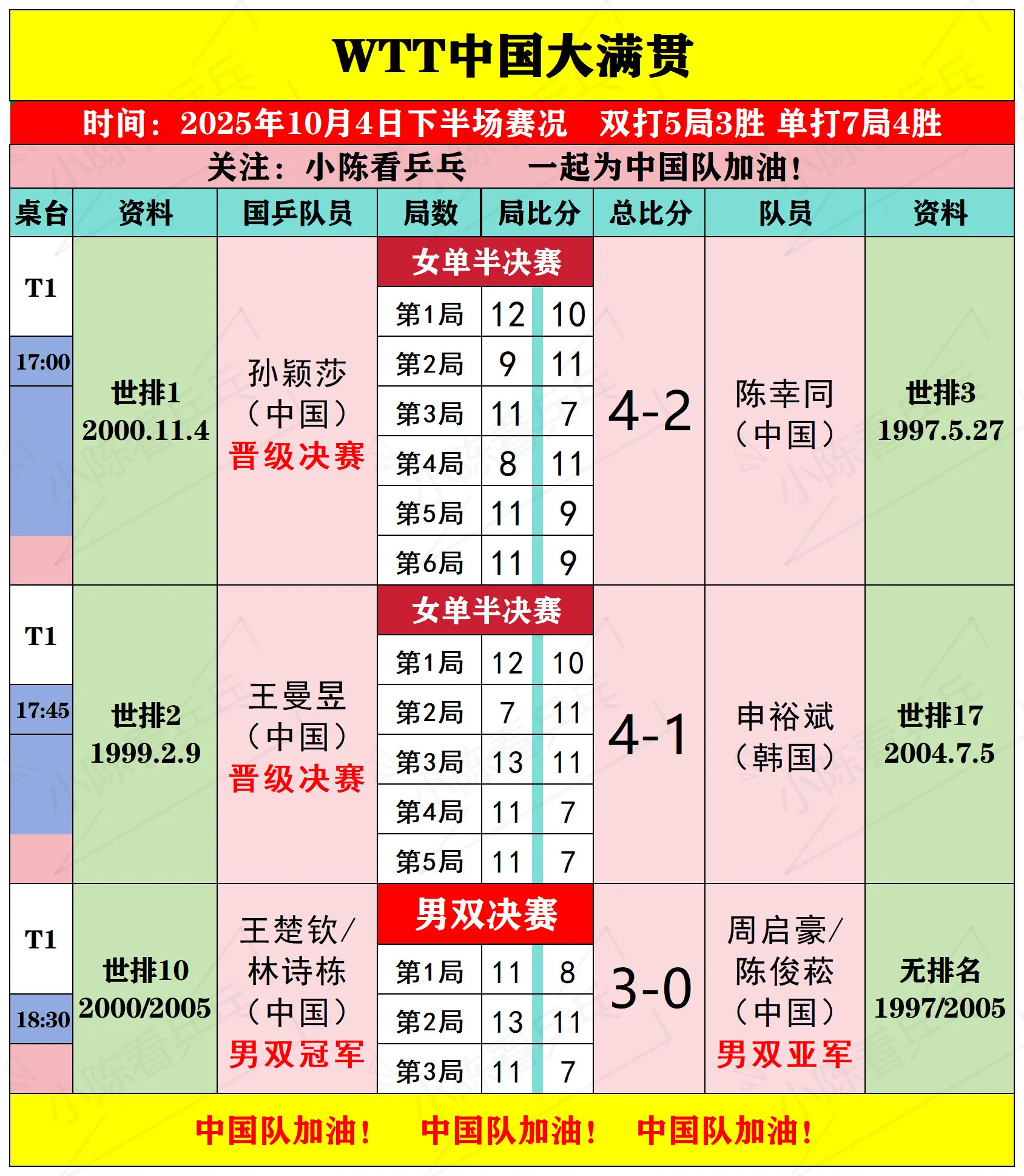WTT中国大满贯10月4日下半场比赛结果。WTT中国大满贯10月4日下...