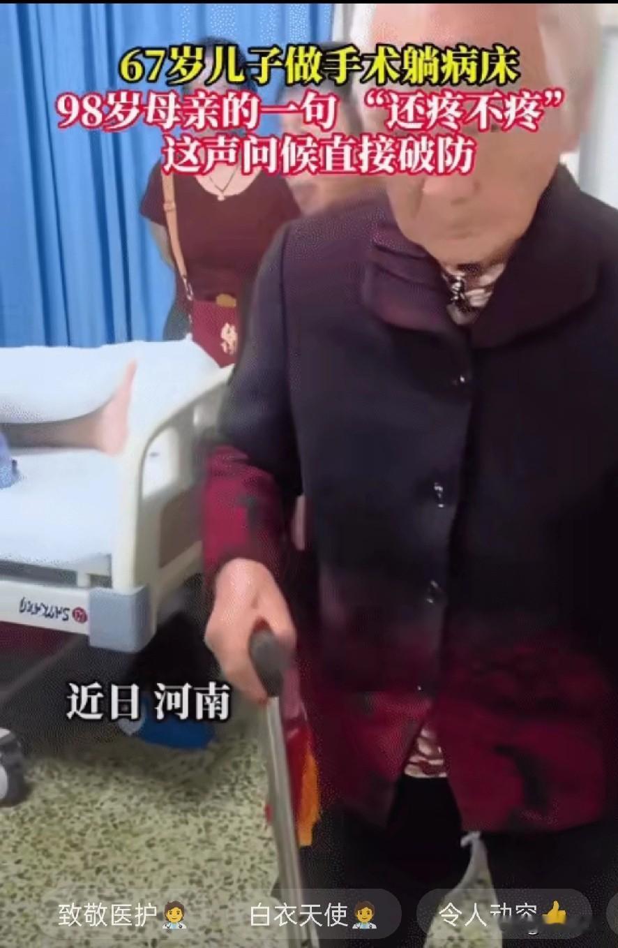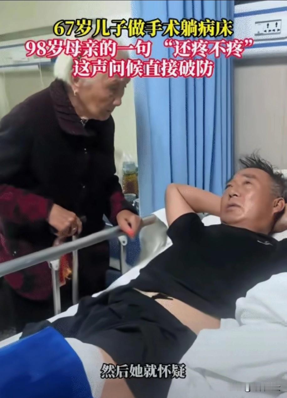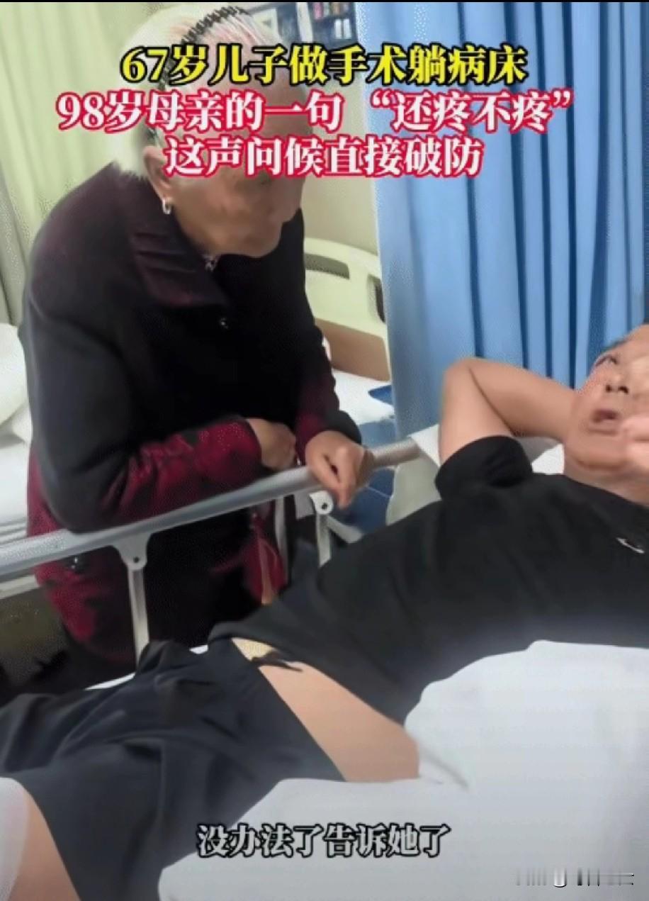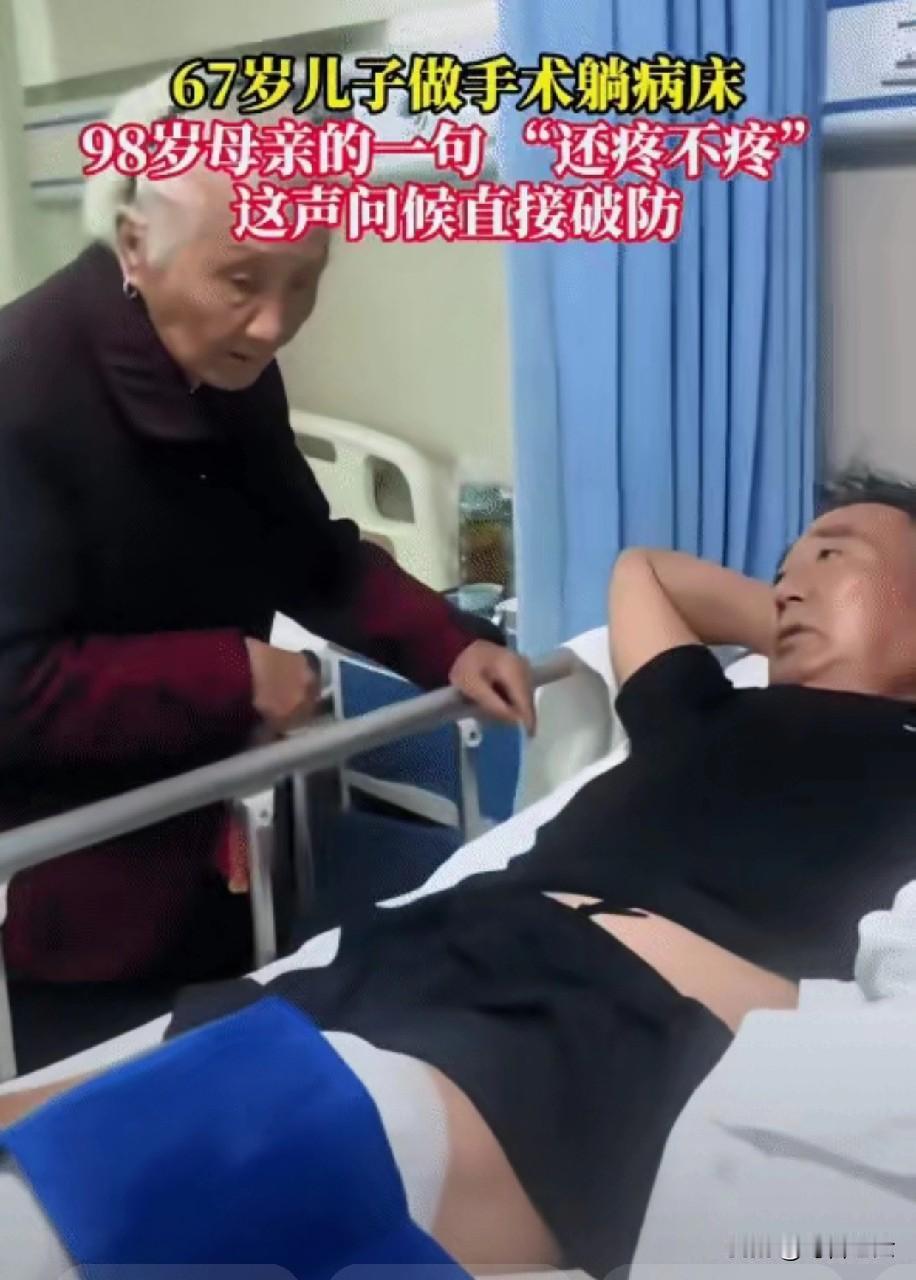 破防了!河南,67岁男子做手术躺病床上。突然,98岁母亲来看望,问他: “还疼不疼。”他说: “不疼。”网友: 不管多大岁数,有母亲的牵挂,就是幸福的。 原来,这位男子因腿疾住院需要做手术,而男子今年67岁了,他的母亲今年98岁了。他去住院时,没有告诉他母亲,怕他母亲担心,还嘱咐家里人不要告诉他母亲。 看到这个事儿,心里挺触动的。一个快七十的人,还能被近百岁的妈妈惦记,问一句“疼不疼”,那种感觉就像回到了小时候。 网友们都说幸福,确实啊,有妈在,永远有人把你当孩子疼。但咱们别光顾着感动,得琢磨琢磨这背后的东西。 儿子为啥要瞒着妈妈?他肯定是想着妈妈年纪大了,身体不好,万一知道了着急上火,反而添乱。 这心思挺细腻的,体现了子女对父母的那种保护欲,怕他们受累。妈妈呢,尽管快一百岁了,还是忍不住跑来看儿子,这种本能的爱,挡都挡不住。 想想看,儿子躺在病床上,嘴上说不疼,心里可能五味杂陈——既感动妈妈来,又愧疚让她操心。 妈妈那边呢,估计整天惦记着孩子,哪怕自己行动不便,也得亲眼看看才放心。 从批判的角度来说,我觉得这种亲情幸福固然美好,但也暴露了现实中的一些难题。 现在人寿命长了,好多家庭都有高龄父母和中年子女共存的情况。子女们往往得在照顾自己和孝顺父母之间找平衡,压力不小。 像这个男子,自己都当爷爷的年纪了,还得担心妈妈的身体,这反映出代际关系的复杂性。 有时候,子女的隐瞒是出于爱,但会不会让父母觉得被隔离在外,反而更焦虑? 母爱无私,可高龄父母的身体和精力有限,这种牵挂可能变成双刃剑——既温暖,又带着负担。 咱们社会老龄化越来越明显,这种场景以后会更常见,怎么让亲情不减负,又不过度消耗彼此,值得深思。 各位读者你们怎么看?欢迎在评论区讨论。