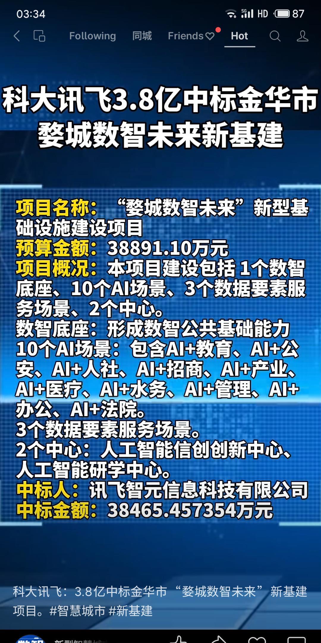 科大讯飞子公司以约3.85亿元中标金华市"婺城数智未来"新基建项目。项目将建设数智底座,涵盖教育、医疗、公安等10个AI应用场景,并打造人工智能创新研发中心,助力区域数字化转型与智慧城市建设。