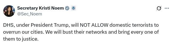🇺🇸诺姆部长誓言严厉打击国内威胁 “在特朗普的领导下,国土安全部不会允许国内恐怖分子占领我们的城市。 我们将摧毁他们的网络,并将他们绳之以法。” 资料来源: @Sec_Noem 🇺🇸 SEC. NOEM VOWS CRACKDOWN ON DOMESTIC THREATS "DHS, under Trump, will NOT ALLOW domestic terrorists to overrun our cities. We will bust their networks and bring every one of them to justice." Source: @Sec_Noem