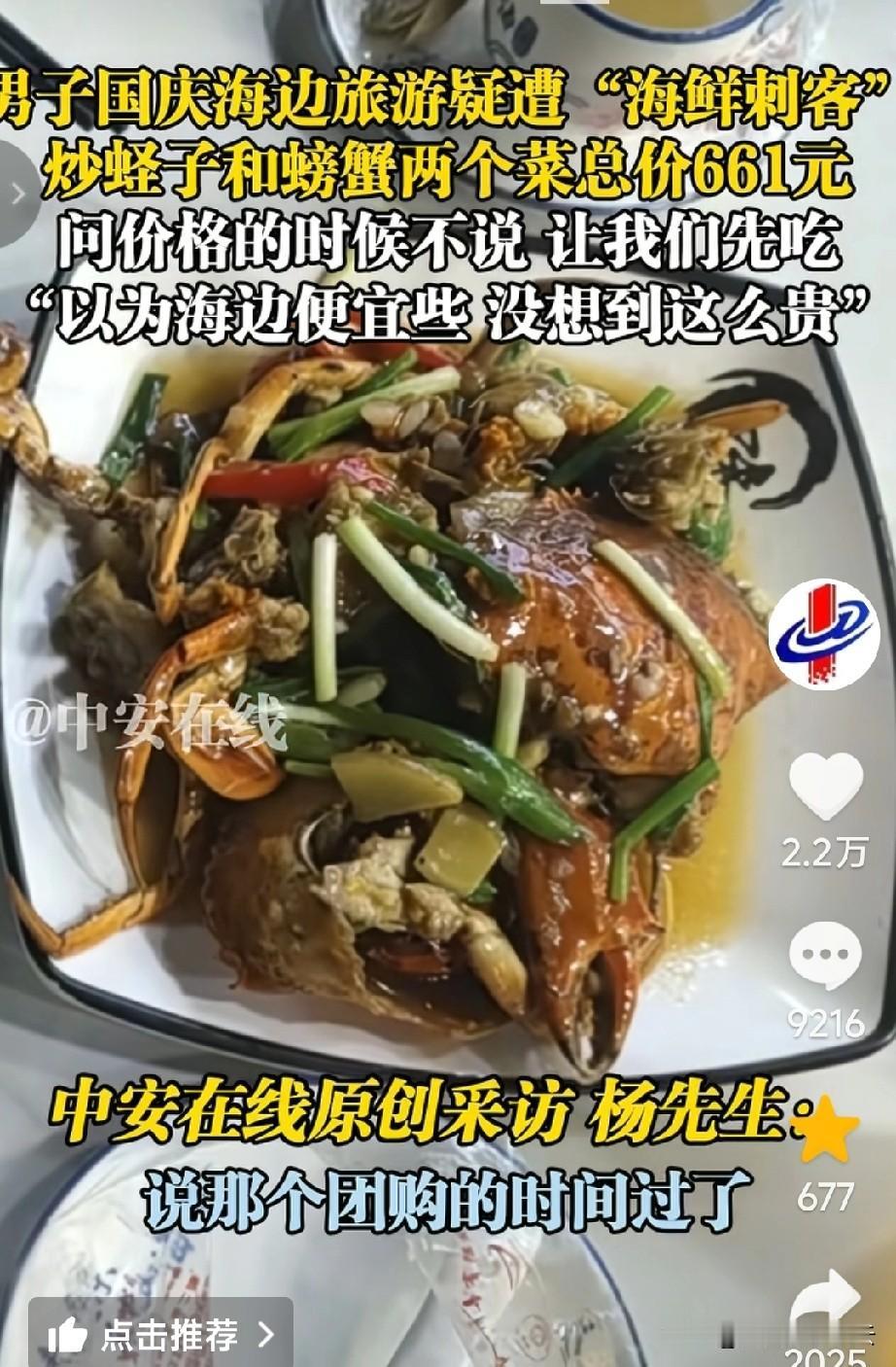 一盘炒蛏子204,一盘螃蟹451,两个菜要661。这是国庆游客在广东遭遇的海鲜刺客。话说这两个菜都很平常,在海边更是便宜。再怎么看,成本也不超过200元。 这还不是重点,最让人生气的是饭店它不明码标价。顾客说他们本来在这家店里点了团购餐,但是到店里后,商家说团购时间过了,不能用了,让他们点餐。 游客点了两个菜,问他们价格,老板不说,就让他们先吃,吃完再算。游客想这是海边,海鲜价格应该比外面更便宜。再说就算不是海边,这两个菜的价格也不贵。 没想到结账的时候,两个菜竟然要661,螃蟹188一斤,蛏子也要68一斤。不同螃蟹的价格不一样,可是蛏子的价格透明,即使是鲜活的也就十几块一斤,老板卖68一斤,足足提高了五六倍。螃蟹的价格也就可想而知了。 但是菜已经吃了,不交钱不行。游客没办法,只好吃哑巴亏。 这种无良商家,就应该举报相关部门,让他尝尝厉害。还有出门在外,买东西前问好价格,否则很容易当冤大头。 对于这件事,你怎么看呢?