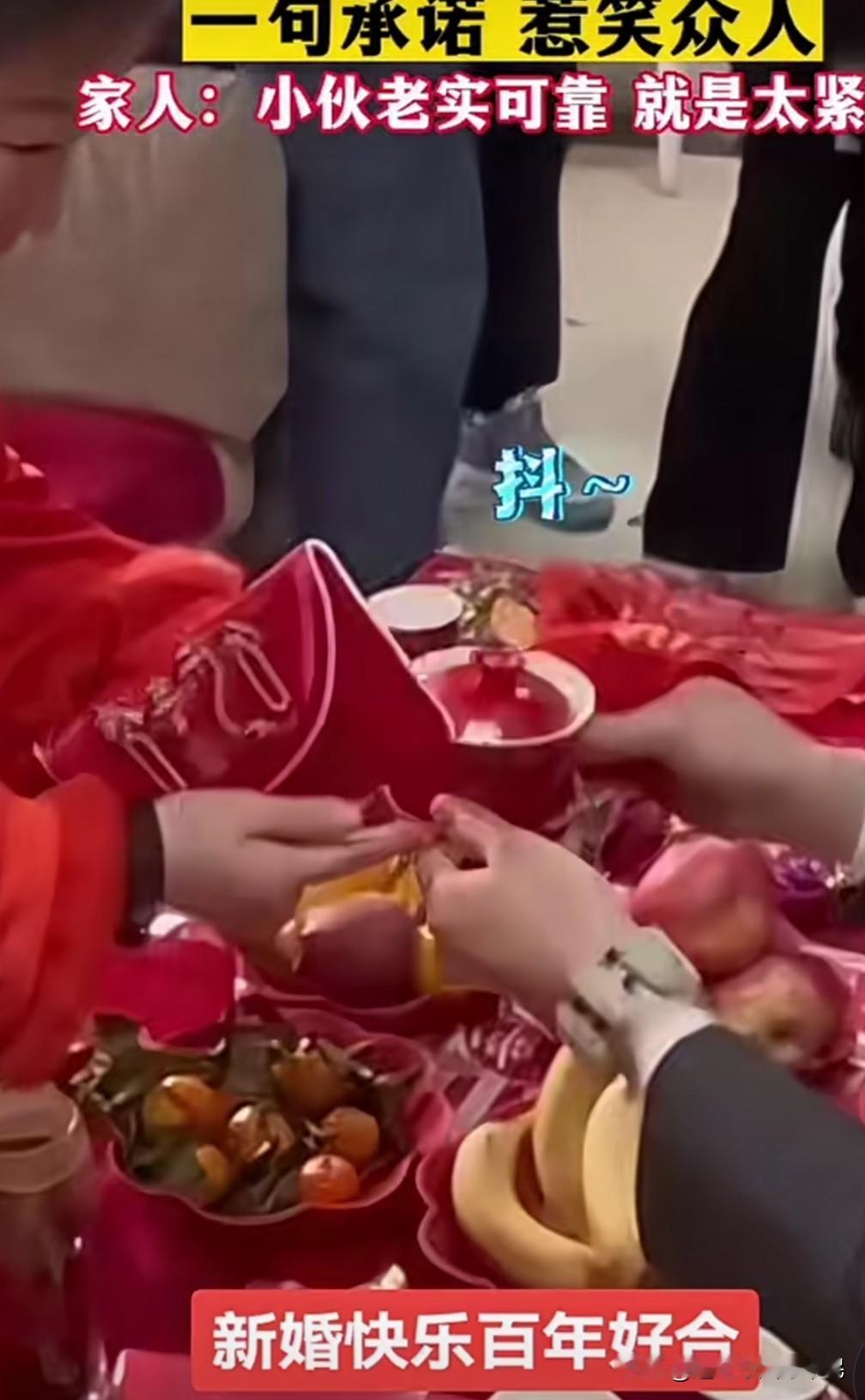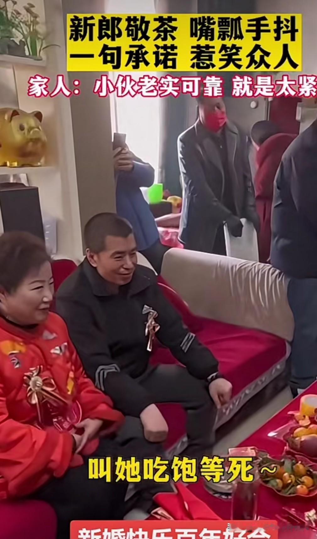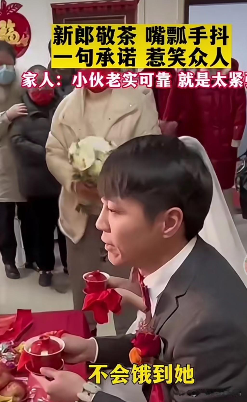 朋友们你们结婚敬酒时候欢不欢乐! “爸爸妈妈你们请放心吧,我不会饿到她” “不会渴到她,就叫她吃饱等死~” “我会照顾好她~” 激动,手里的茶杯都在疯狂抖动 哈哈哈,新郎确实紧张了 不管怎样,反正是不抛弃不放弃。 看出紧张了,但是对媳妇挺好,啥都不用干,就让媳妇吃饱等死~ 新娘:新郎说的话我不知道是该感动,还是该害怕呢!