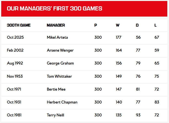 阿尔特塔300场比赛数据&阿森纳历任教练前300场比赛成绩