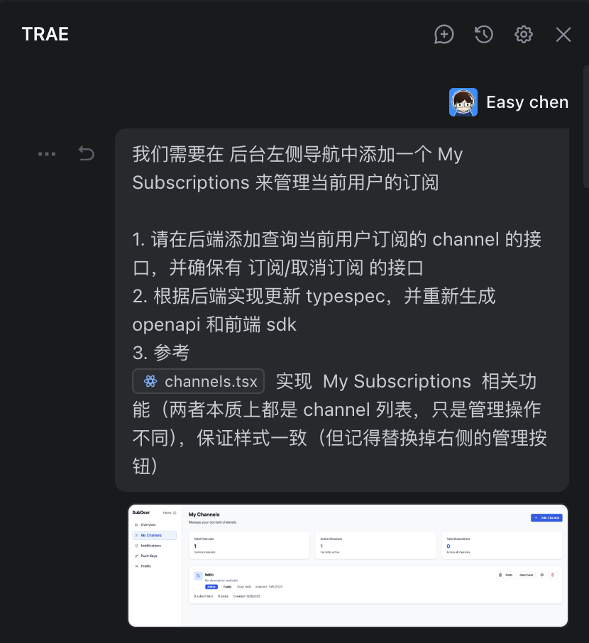 Easy同学正在独立开发 经常有同学问 Cusor/Trae 这类工具中的提示词应该怎么写…… 我个人的感觉吧,这里就是一个多轮聊天界面,不用像生图那样太纠结提示词。