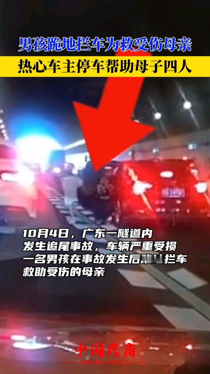 10月4日,广州华南快速干线石门堂山隧道内发生的一幕,让无数人为之动容。10岁男孩小宇和妈妈、两个妹妹驾车出游,隧道里突然发生车祸,安全气囊弹出,妈妈叶女士陷入昏迷,两个妹妹吓得蜷缩成一团。小宇“咚”地一声跪在地上,双手死死抓住路过司机的胳膊,哭着喊道:“叔叔,救救我妈妈!她不动了!” 这一幕被行车记录仪记录下来后,在网上引发广泛关注。网友们深受触动,纷纷表示这一跪展现出令人动容的担当。后来妈妈苏醒过来,说“他最害怕的就是我不在了”。好在众人纷纷伸出援手,妈妈并无大碍。这既体现了男孩的勇敢担当,也彰显了路人的善意,实在是太暖心了。 广州交通事故 广州隧道