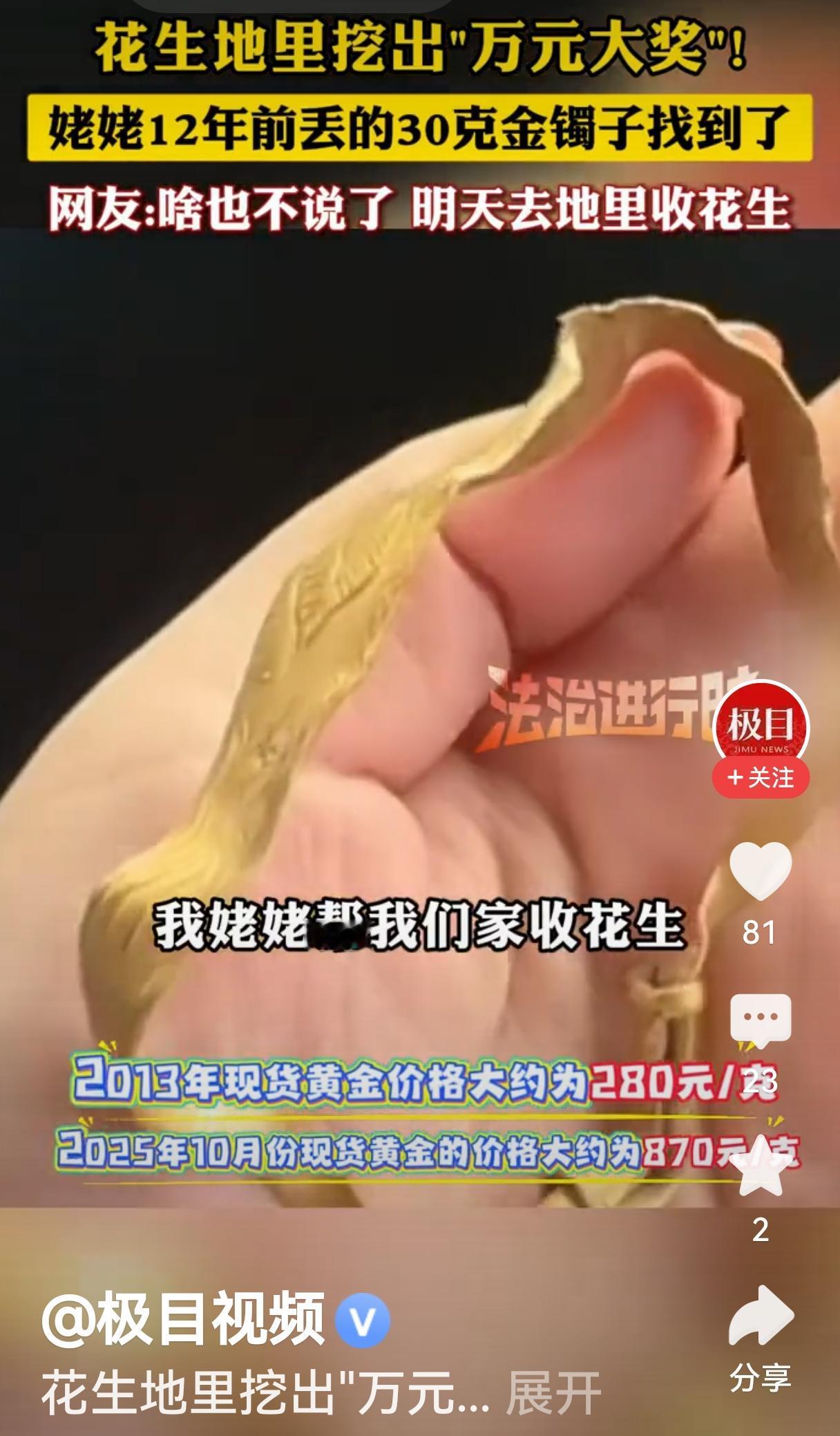河北唐山一个女子,竟然从花生地里找到了姥姥丢失了12年的金镯子,确实让人非常惊异