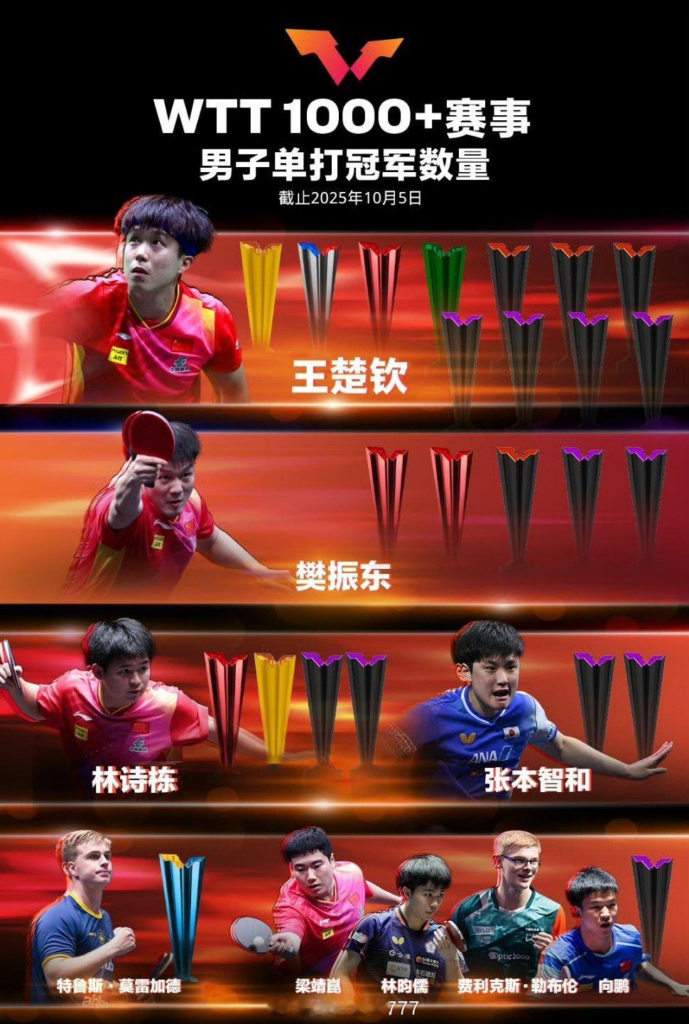 WTT官方更新1000+赛事男单冠军榜,王楚钦以11座单打冠军领跑男单冠军榜!