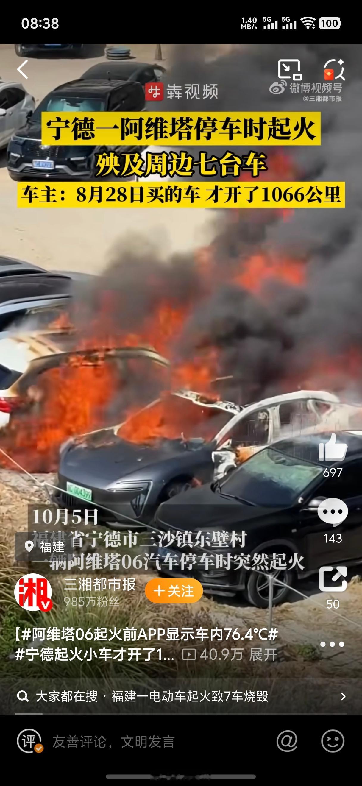 阿维塔06起火前APP显示车内76.4℃直接说阿维塔06起火就行了,还说什么宁德起火小车,看得一愣一愣的,最后才发现,是在宁德这个地方,用宁德时代电池的阿维塔06起火了。。。[允悲]