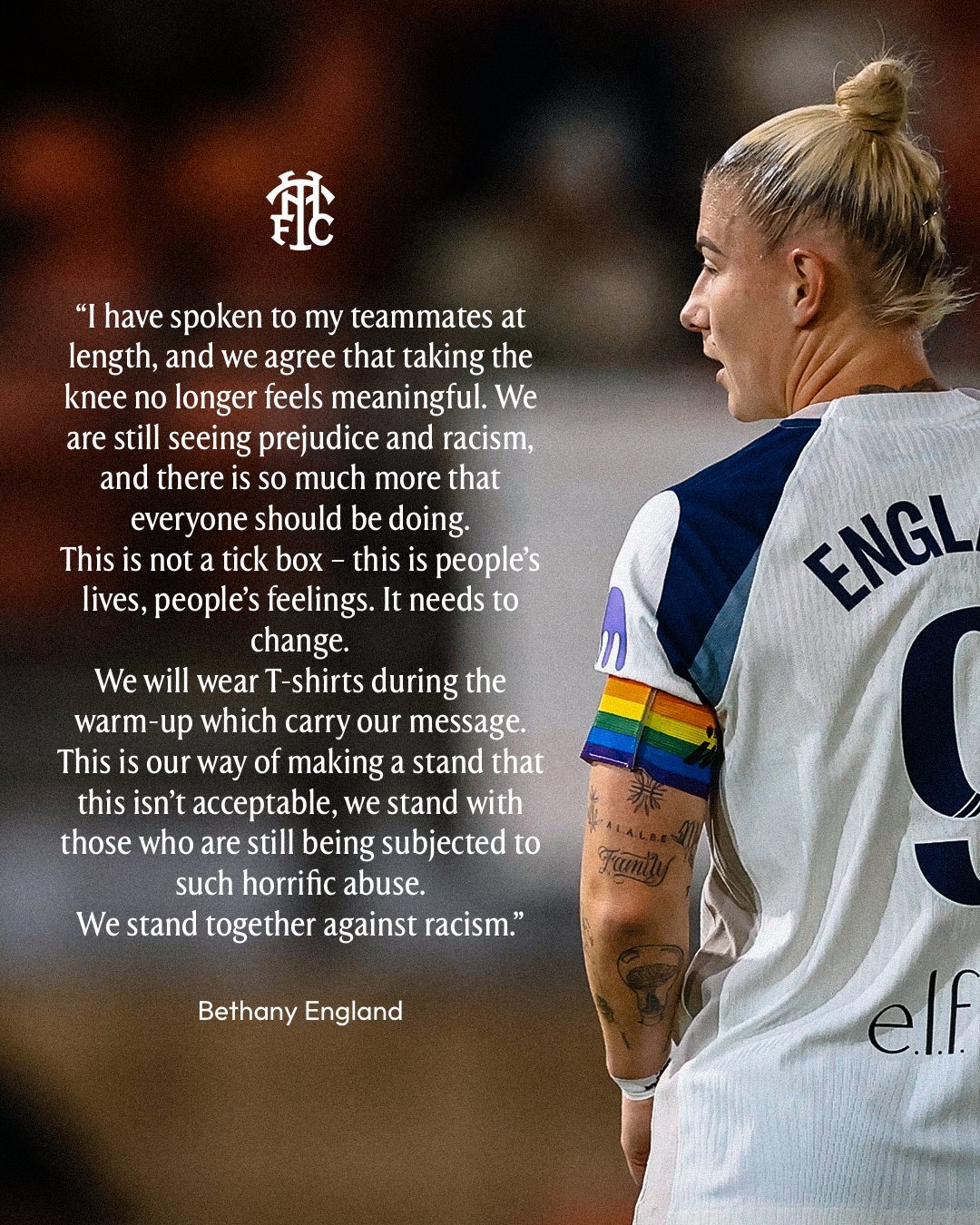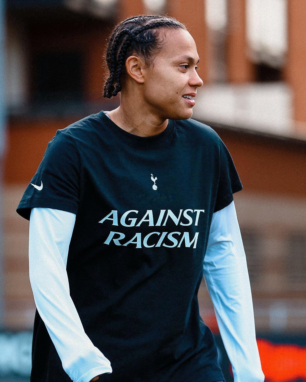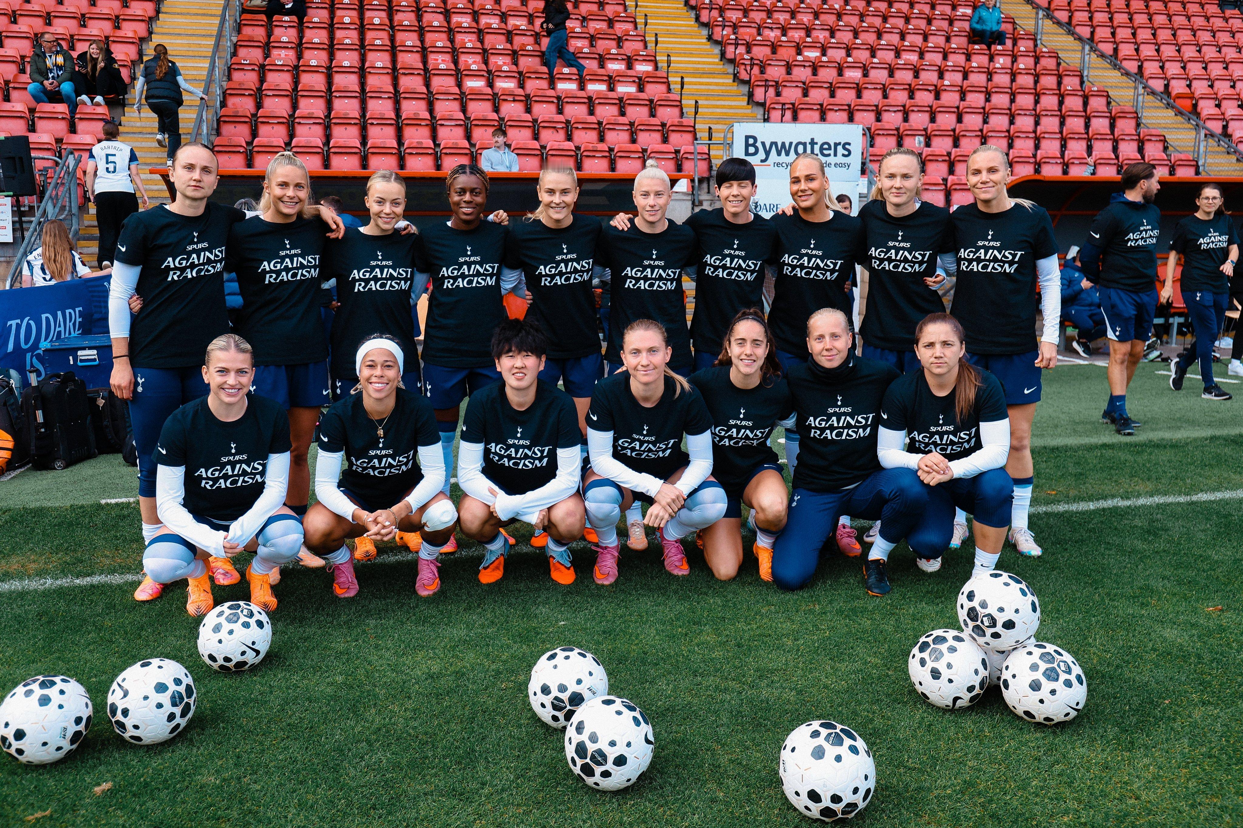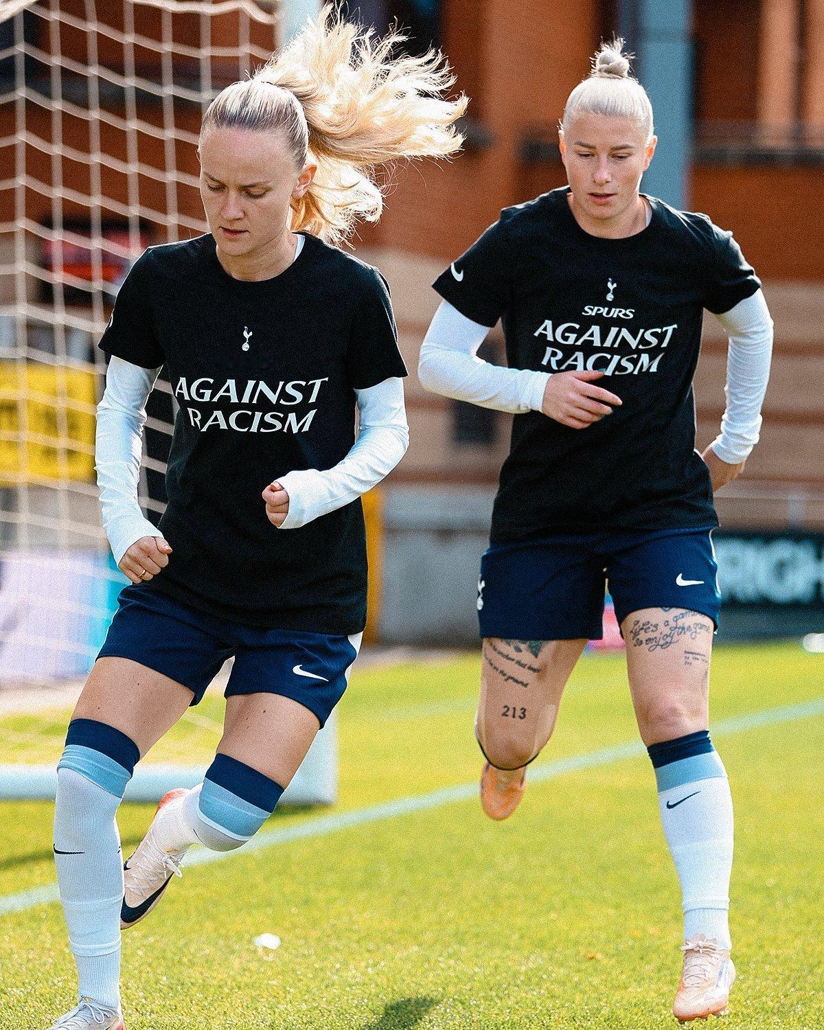 热刺女足选择不再进行单膝下跪反对种族歧视的仪式,而是在热身时穿上“Against Racism”的T恤