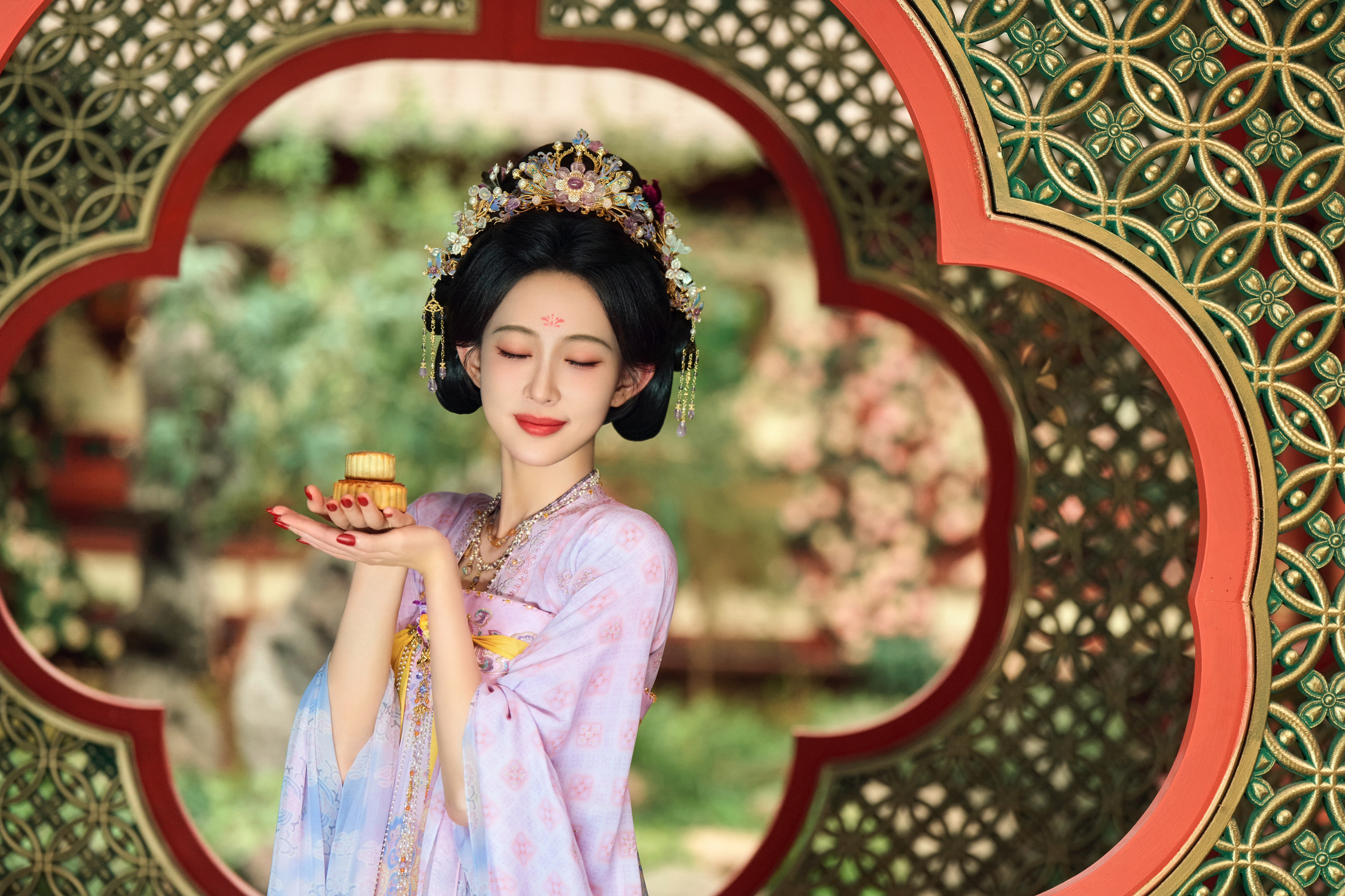 孟子义 一袭唐制汉服,鬓间珠翠摇曳,额间花钿灼灼。孟子义分你一半月饼 有点子义思