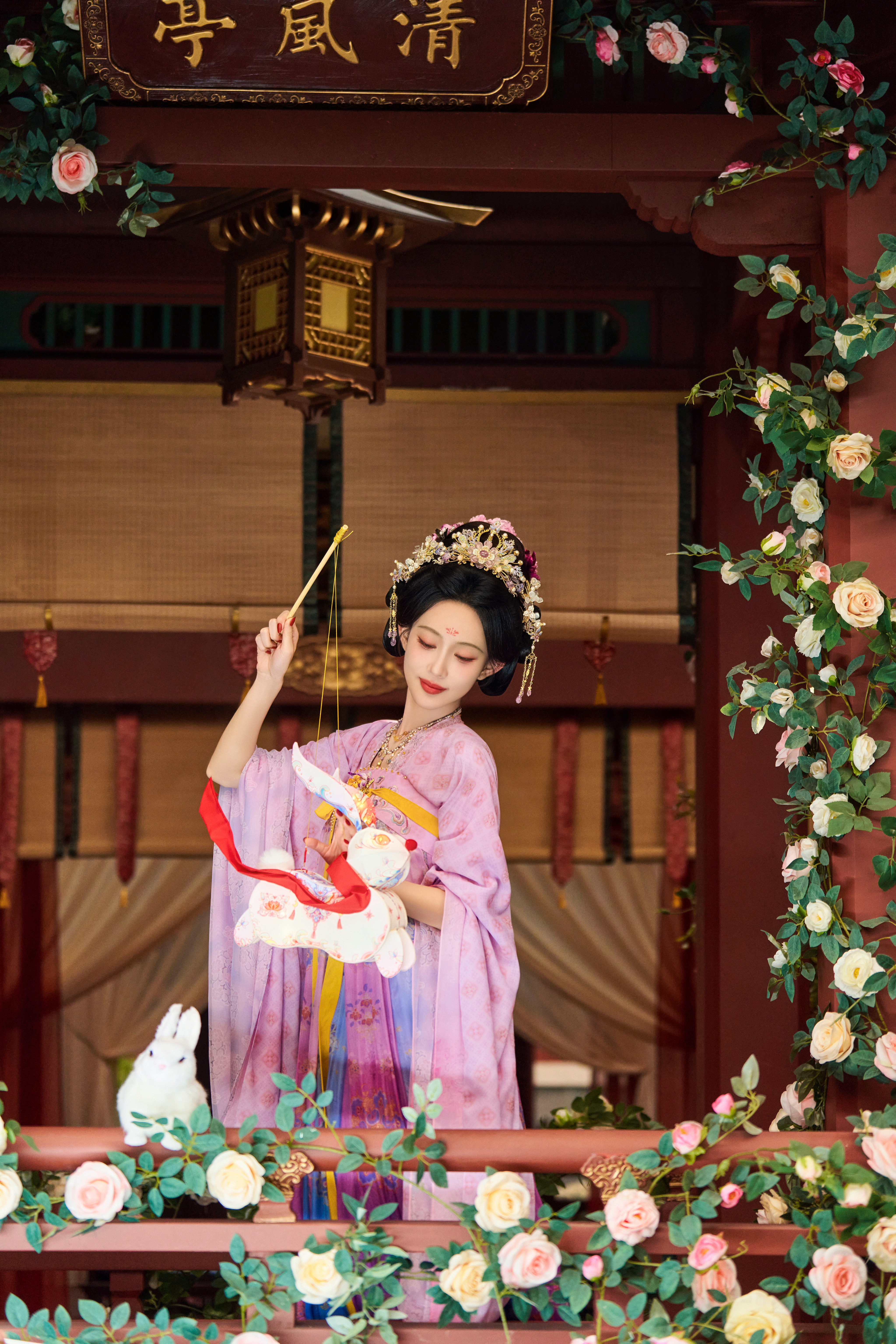 孟子义一袭唐制汉服,鬓间珠翠摇曳,额间花钿灼灼。孟子义分你一半月饼有点子义思