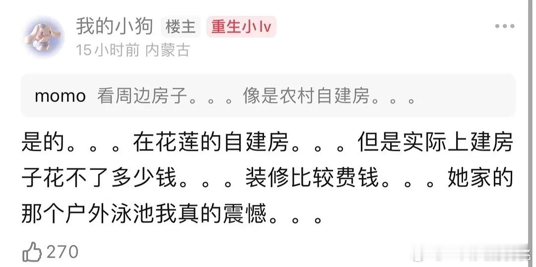 谢依霖用80分钟介绍了自家的自建房可见多大[泪奔]她早期在内地赚的真不少,电影综艺常客,后面不知道是不是结婚生子就不怎么来了,但是前期真的吃了好多红利