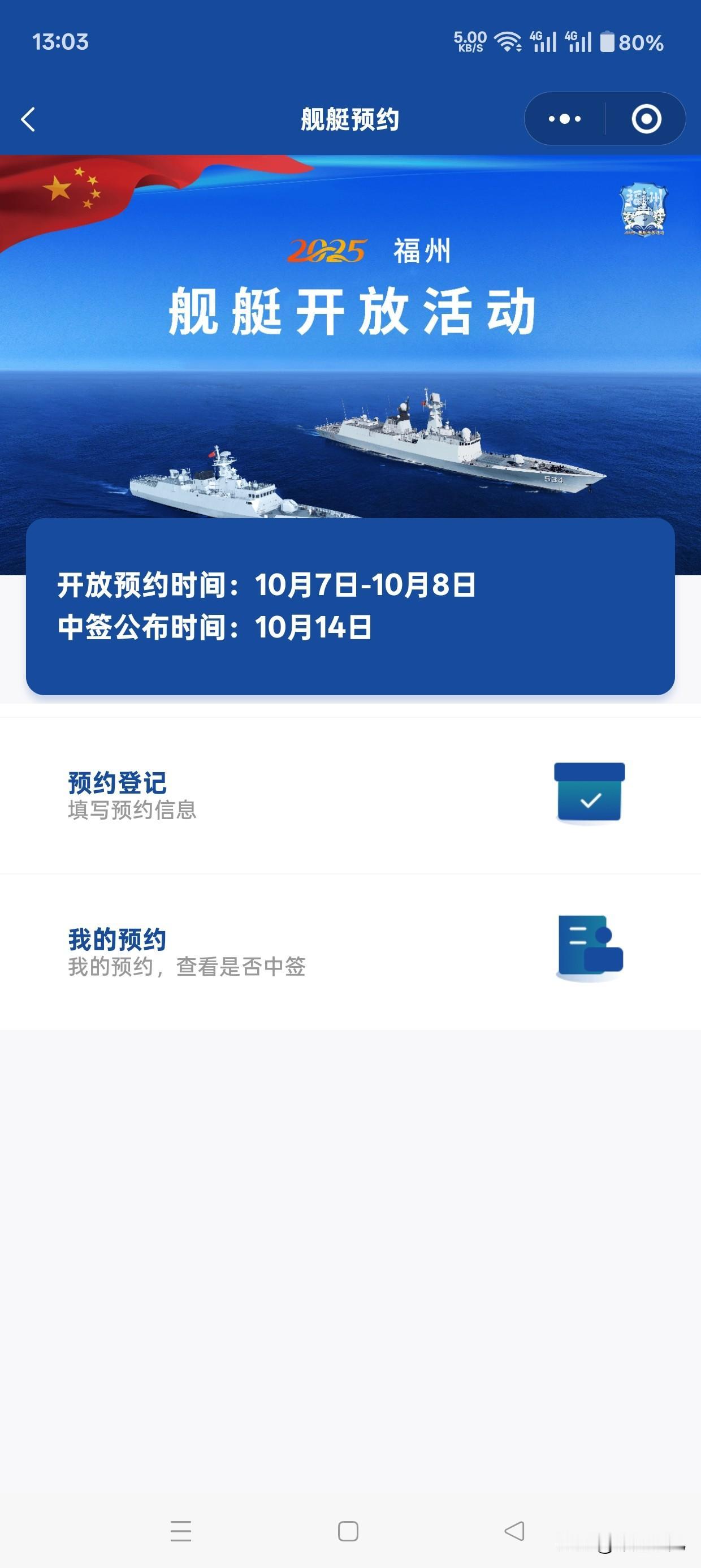 福州重磅福利!10月可预约登舰,与海军军舰“舰”一面! 想近距离感受人民海军的威武雄壮吗?机会来了! 据官方消息,2025年10月17日至19日,福州将在 船政文化城船政码头 举行舰艇开放活动。届时,广大市民和游客将有机会预约登舰,与海军军舰来一次“零距离”接触! 这不仅是一次难得的体验,更是增强海防意识、感受强国强军力量的生动课堂。 【活动速览】 · 时间:10月17日-19日(共三天,注意具体上午/下午时段) · 地点:福州·船政文化城船政码头 · 关键:需提前预约,请务必关注官方渠道获取预约手册。 10月7日,10月8日,开始预约,今年舰艇开放活动采取“扫码预约注册,摇号中签”模式,每个手机号最多可注册4个人信息。10月14日,系统将随机抽签确定中签观众和参观时段并短信通知中签观众。国庆舰艇开放 家人们,手速要快!这种机会可不常有,带上家人朋友,一起去感受我们的大国重器,接受一场爱国主义教育的洗礼吧!