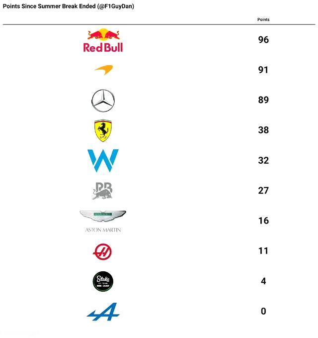 乐扣心里很明亮,法拉利完蛋了……乐扣在记者面前也放飞自我。 “说难听点,我们现在是第四车队,铁第四,跟前三都不是一个档次。” “梅奔升级成功,红牛5场之前在蒙扎就升级成功了……还是4场来着?不管了,现在一赛季比赛也太多了。” 图二:夏休后各车队收获的积分,红牛96分、迈凯伦91分、梅奔89分。