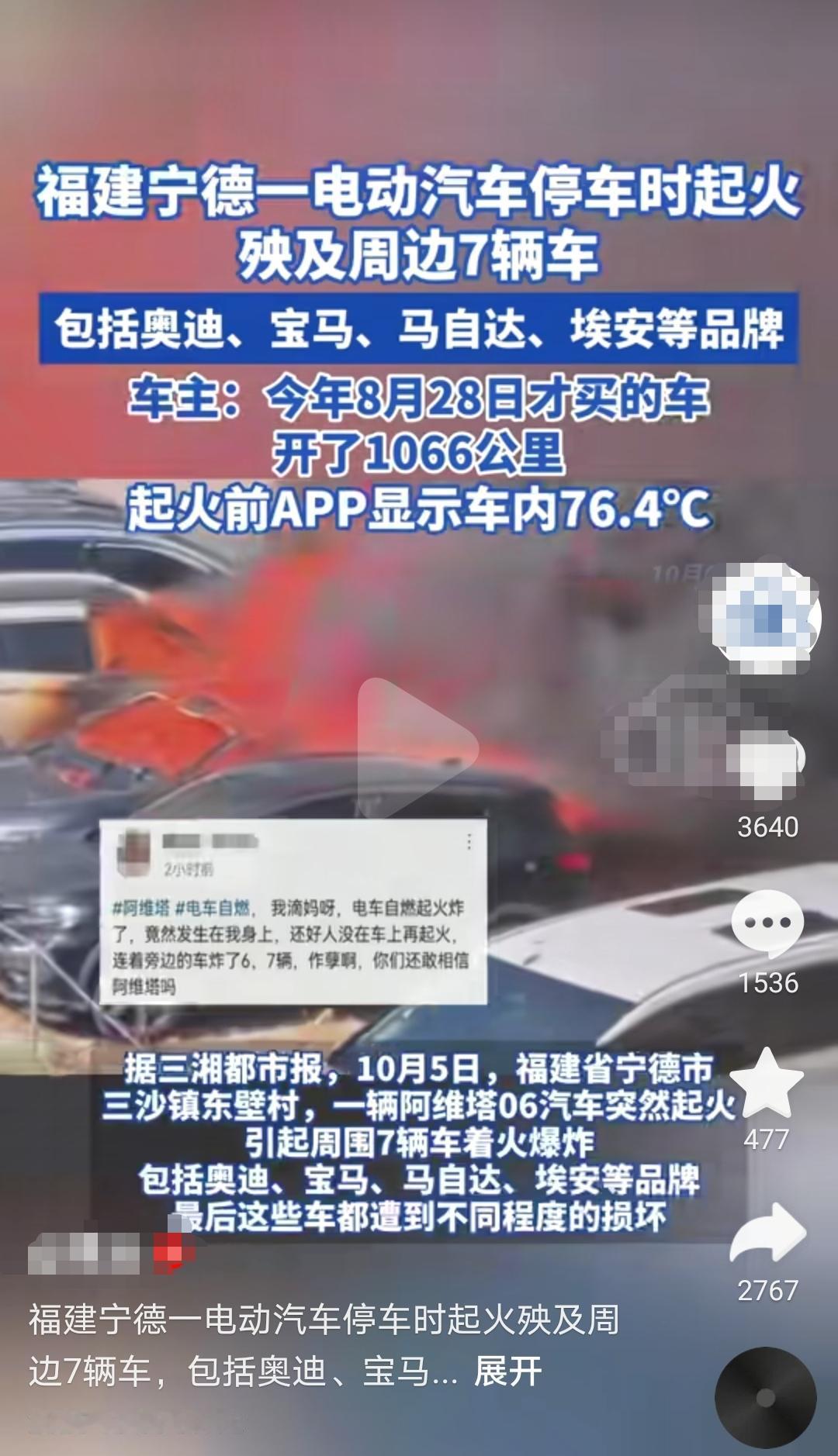 福建宁德这事儿太让人揪心了!一辆刚买不久的电动车突然起火,把旁边7辆车都给连累了,里面还有奥迪、宝马这些好车呢。 车主说车是8月28号才买的,才开了1066公里,起火前APP显示车内温度都到76.4℃了。想想都后怕,要是当时有人在车里,后果真不敢想。现在好几辆好车都被烧得不成样子,这损失谁看了不心疼…