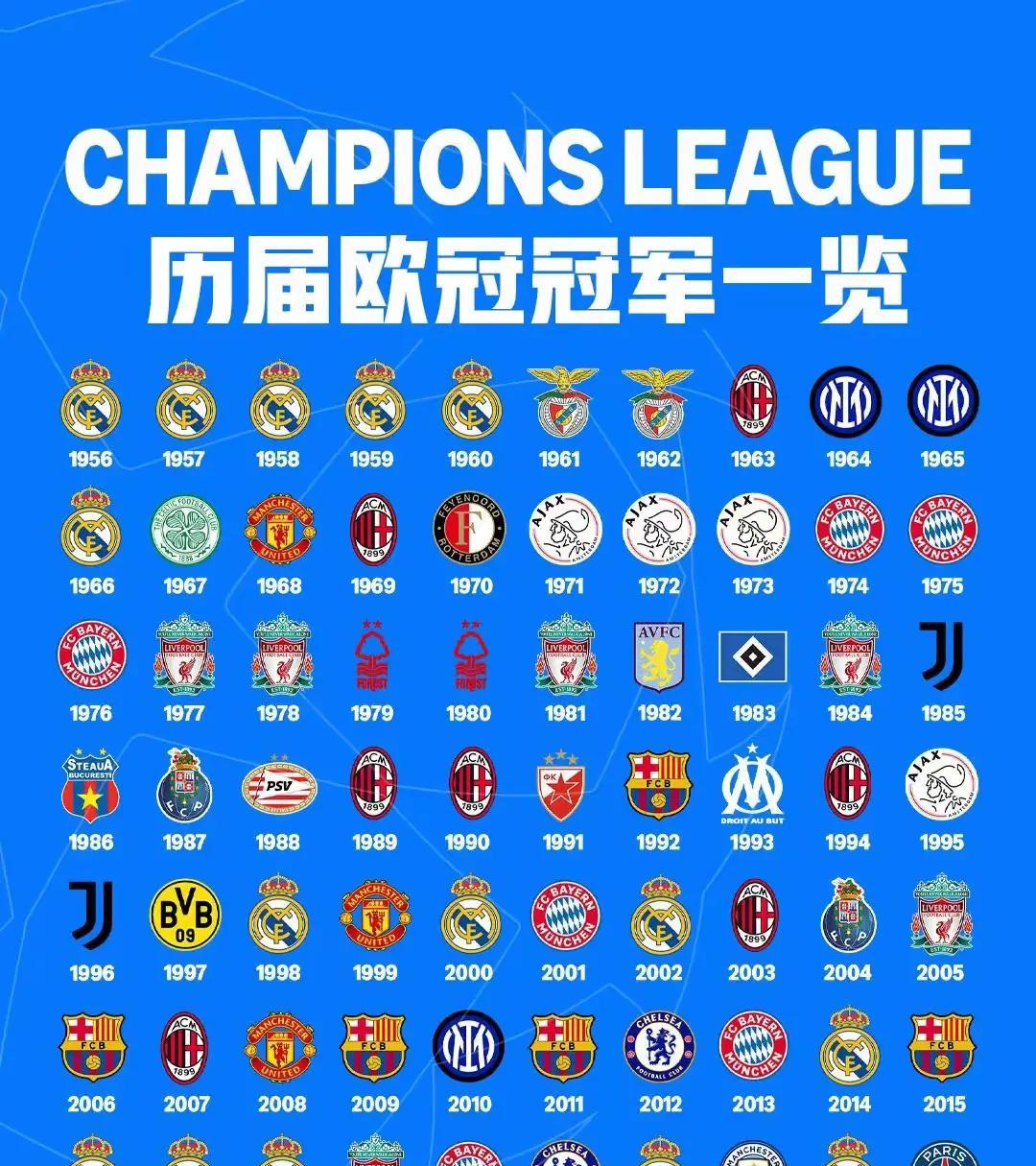 1956年以来历届欧冠冠军一览表,1956-1960年皇马直接来了个五连冠,皇马是夺得欧冠冠军最多的球队,这是毫无争议的,可见皇马的冠军底蕴有多深厚。英超的诺丁汉森林1979-1980也曾经两次夺得欧冠冠军,这是很多球迷都想不到的,诺丁汉森林祖上也曾经阔绰过。