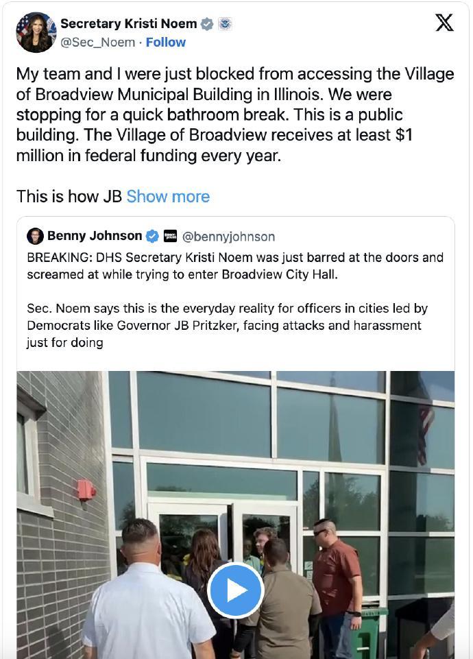 美部长想上厕所被拒后暴怒发帖 据美国福克斯新闻网3日报道,美国国土安全部部长诺姆于周五表示,她与工作人员在芝加哥郊区试图进入一政府大楼短暂如厕时遭拒。 诺姆在社交平台X上发文称,“刚刚在伊利诺伊州,我和团队被阻止进入布罗德维尤市政大楼,我们只是想进去快速上个厕所。 换作普通人被拒可能也就算了,可诺姆是联邦执法系统的头头之一,去的还是每年拿 100 万美元联邦资金的公共建筑,这拒绝就太戳人了。她在社交平台上发火一点不奇怪,换谁遭遇这种明摆着的羞辱都得气炸,“简直是耻辱” 这四个字,藏着的是联邦官员被地方打脸的憋屈。 但千万别以为这只是地方工作人员不懂事,这背后全是政治斗争的影子。布罗德维尤归伊利诺伊州管,州长普里茨克是民主党人,而诺姆是特朗普阵营的核心干将,这俩早就不对付了。 普里茨克的办公室之前就公开嘲讽诺姆,说她总在电视上 “cosplay 执法人员”,还拿她早年杀狗的旧事说事儿,警告当地宠物主人看好自家猫狗,这敌意藏都藏不住。 你想啊,州长层面都这态度,底下的市政官员能给诺姆好脸色吗?这哪儿是拒绝如厕,分明是借着这点小事给联邦政府甩脸子,给诺姆难堪。 更让人窝火的是那 100 万美元联邦资金的事儿。地方拿了联邦的钱,却连基本的便利都不给联邦执法人员,这事儿搁哪儿都说不通。 而且这不是联邦第一次被蓝州 “摆脸色” 了,特朗普之前就因为党争冻结过给民主党主导州的 260 亿美元资金,其中 180 亿是给纽约州修地铁和隧道的钱,就因为纽约州的民主党议员跟他对着干。 结果呢?项目一耽误,光哈得孙河隧道一个月就得多花几千万,最后坑的还是老百姓。布罗德维尤拿了钱不办事,本质上跟这是一个路子,都是两党斗争捎带着把公务和民生当筹码。 诺姆发怒的底气,其实也来自联邦法规的支撑。美国联邦法规里写得明明白白,政府财产可以供公职人员办理公务时使用,哪怕是像用电、用点纸这种微不足道的个人消耗都允许,更别说内急这种生理刚需了。 布罗德维尤市政大楼作为拿联邦钱的公共建筑,按理说是没理由拒绝的,可他们就是敢拒,说白了就是吃准了有州长撑腰,故意跟联邦执法系统对着干。 这事儿往大了说,就是美国联邦与地方权力斗争的缩影。最近特朗普刚授权给伊利诺伊州派 300 名国民警卫队,普里茨克直接骂这是 “侵略行为”,说死都不配合。 为啥这么僵?因为联邦执法人员在芝加哥搞的移民突袭太不得人心,深夜踹门抓人,连老人小孩都拖拽,直升机在天上盘旋,跟打仗似的,当地老百姓都喊 “这里不是战区”。 普里茨克本来就反对这种强硬做法,正好借着厕所这事儿发泄对联邦执法的不满,既能恶心诺姆,又能给当地选民看 “自己硬刚联邦” 的姿态,简直是一举两得。 可话说回来,不管两党怎么斗,联邦和地方怎么闹,最受影响的还是普通人和基层执法人员。之前联邦政府停摆,特朗普威胁要裁掉 30 万联邦雇员,这些人上有老下有小,就因为政客们争权夺利要丢饭碗,最后还是工会告到法院才暂时保住工作。 芝加哥那边更乱,联邦执法人员的车被当地人围堵撞击,不得已开枪自卫伤了人,芝加哥警方还说自己 “只是记录情况” 不帮忙,这执法人员夹在中间多难受?现在倒好,连上个厕所都成了斗争工具,以后联邦和地方的活儿还怎么配合着干? 诺姆这通火发得其实挺及时,把藏在台面下的矛盾全挑明了。这根本不是厕所用不用的小事,是拿了纳税人的钱却不办人事,是把政治斗争凌驾于基本公务之上的大问题。 布罗德维尤每年 100 万联邦资金,要是真用在刀刃上,修个公厕都够了,可他们宁愿把钱花在别的地方,也不愿给联邦执法人员行个方便,这不是耻辱是什么?普里茨克一边骂联邦 “侵略”,一边拿着联邦的钱运转地方政府,这种双标嘴脸才真让人不齿。 现在美国这政治环境真是越来越离谱,两党斗得连基本的人情世故都不讲了。以前就算有分歧,公职人员之间的基本尊重还是有的,现在倒好,上个厕所都能变成攻击对方的武器。 照这么闹下去,联邦和地方迟早得彻底闹掰,到时候受损的还是美国老百姓的利益。诺姆的暴怒,与其说是个人情绪爆发,不如说是对这种畸形政治生态的控诉,这事儿换谁看了都得说一句:太不像话了!