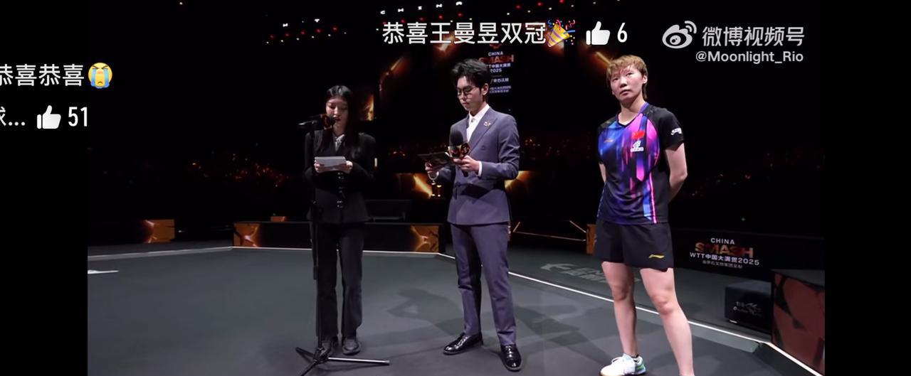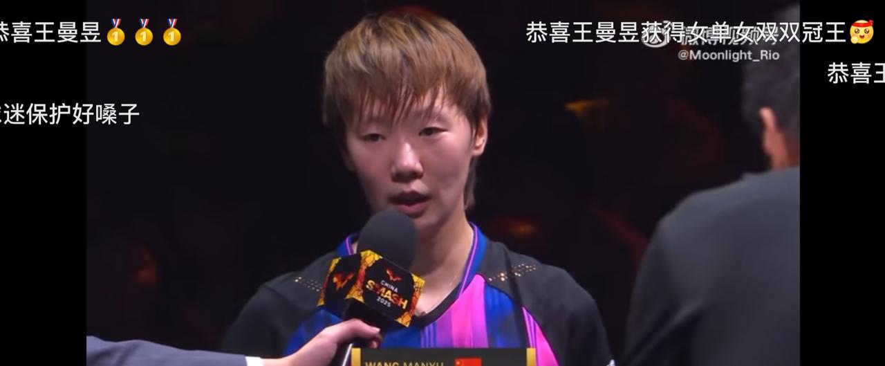 “这次和莎莎在决赛交手,之前几次决赛我都输了,所以今天完全是抱着拼她、向她学习和挑战的心态去打的。能赢下比赛我特别开心,莎莎今天发挥得也很好,只能说我运气稍好一些~ 每次和莎莎交手都能学到很多,比赛里我们要随时应变、互相博弈,这个过程让我成长很多。包括前面对外战、还有女双的比赛,这次北京大满贯对我来说收获真的特别大!” 最后收获一位懵懵的双冠王[羞嗒嗒]#王曼昱中国大满贯双冠王#