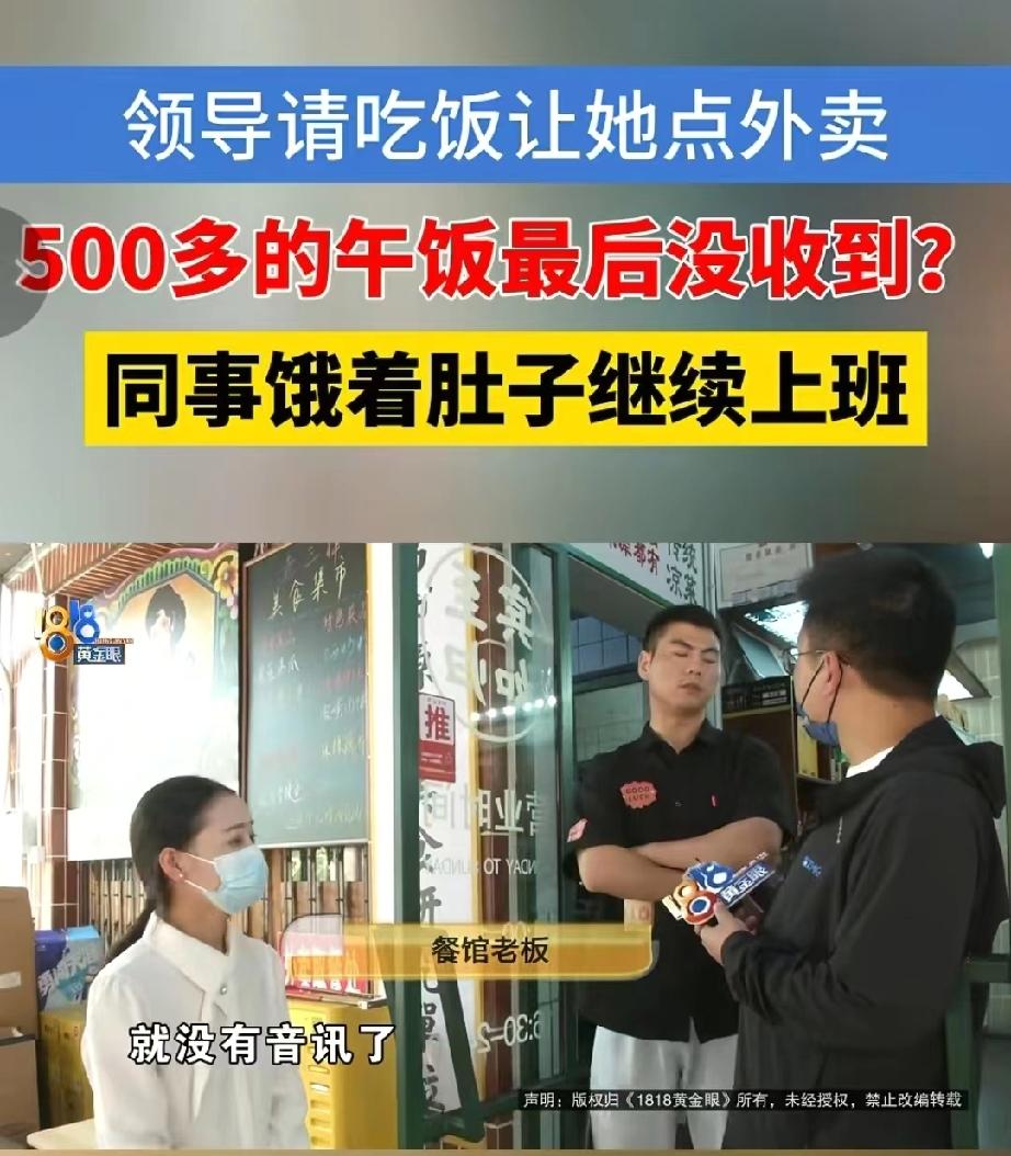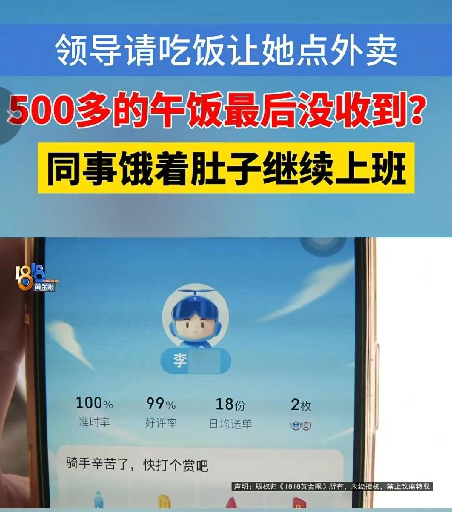 浙江杭州,领导请同事们吃饭,让女子帮忙点了500多元的外卖午餐。下单后,女子因为