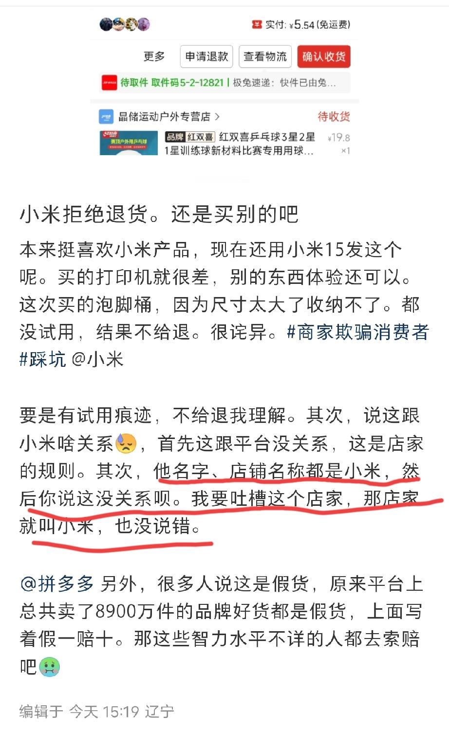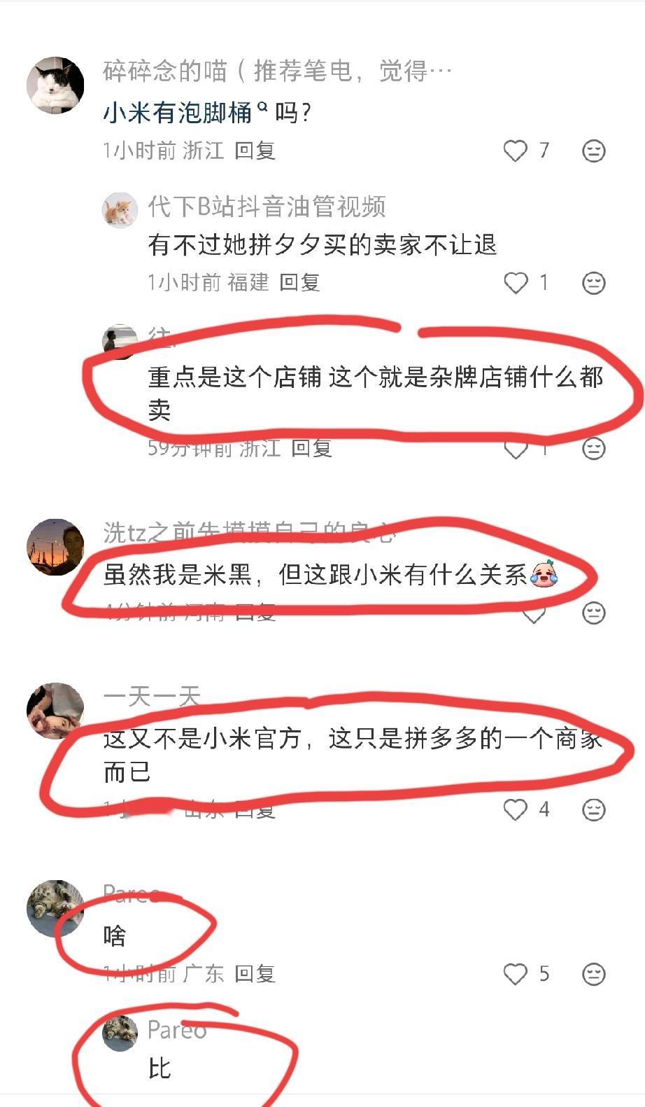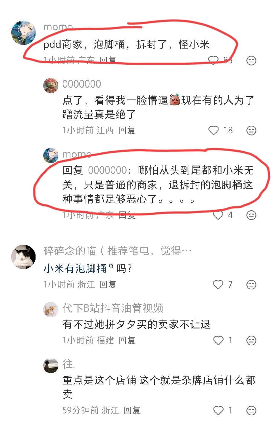 网友在拼多多平台一家挂着“小米品牌”抬头的店铺里面买了一件泡脚桶,因为尺寸太大,不方便收纳,想退货,被商家拒绝了。 这位网友把这个事情发布到网上吐槽了一下,却被评论区网友好一顿调侃,甚至有网友直接骂他“sb”。 “pdd商家,泡脚桶,拆封了,怪小米”。 “哪怕从头到尾都和小米无关,只是普通的商家,退拆封的泡脚桶这种事情都足够恶心了” …… 我感觉这位买家说的没有问题,而评论区网友也说的在理。那到底是谁错了呢?